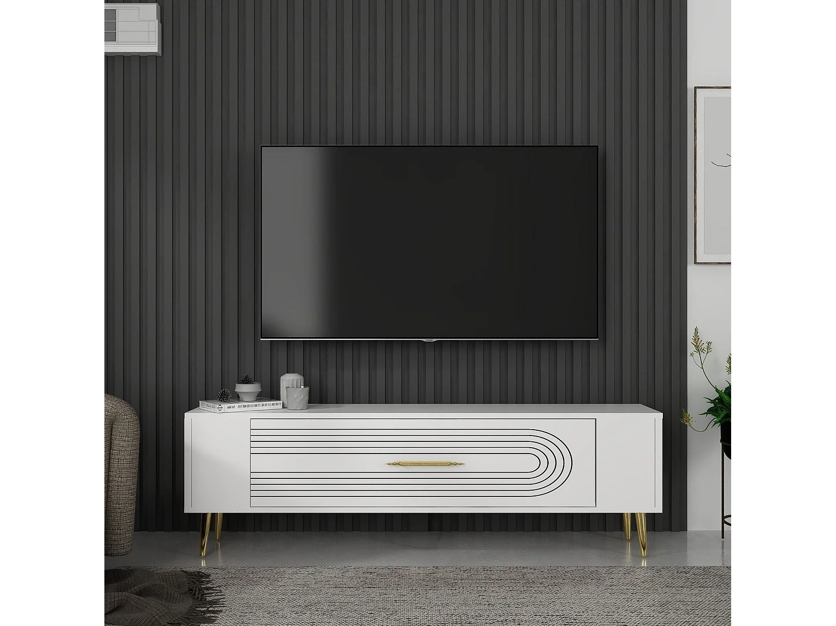 Móvel de TV – 150 cm – Branco e Dourado – Painéis de partículas revestidos a melamina
