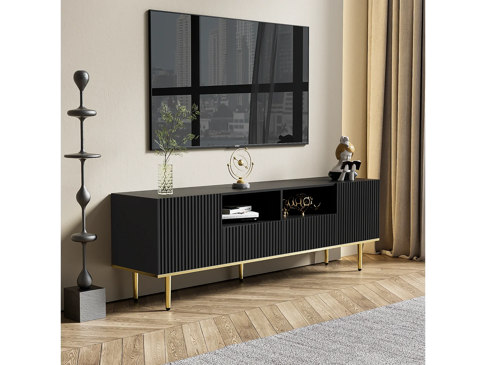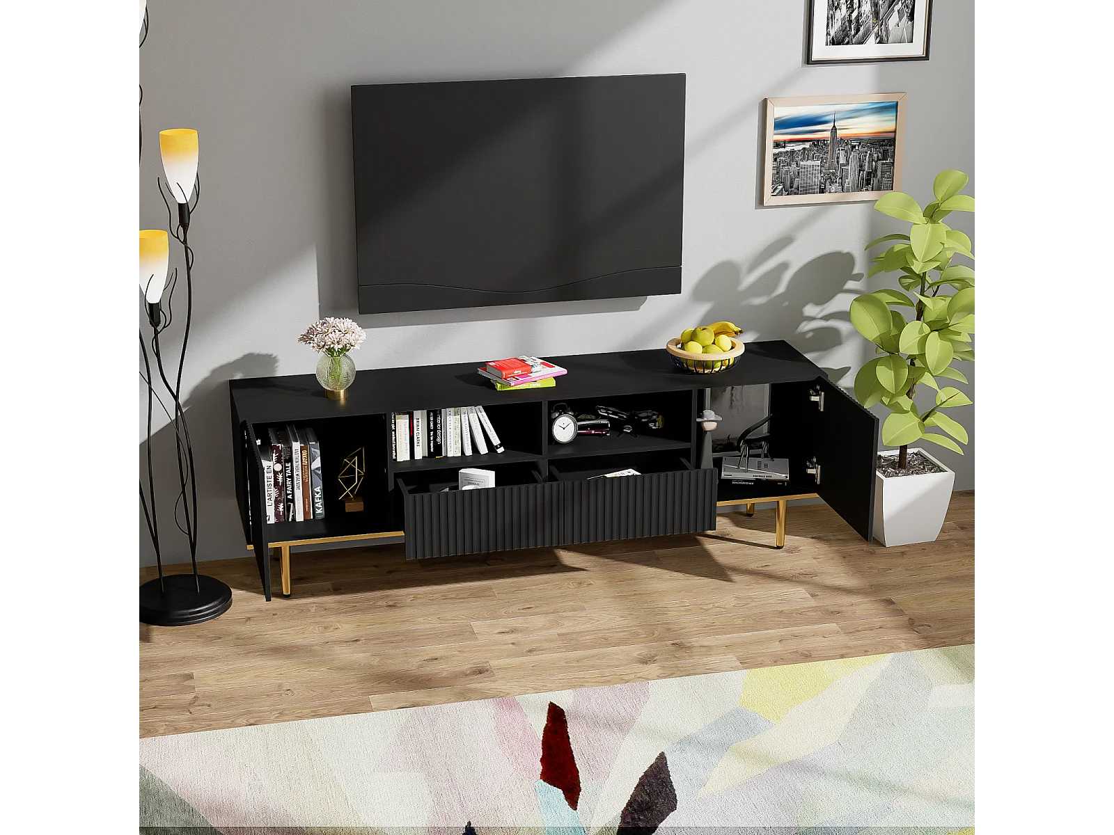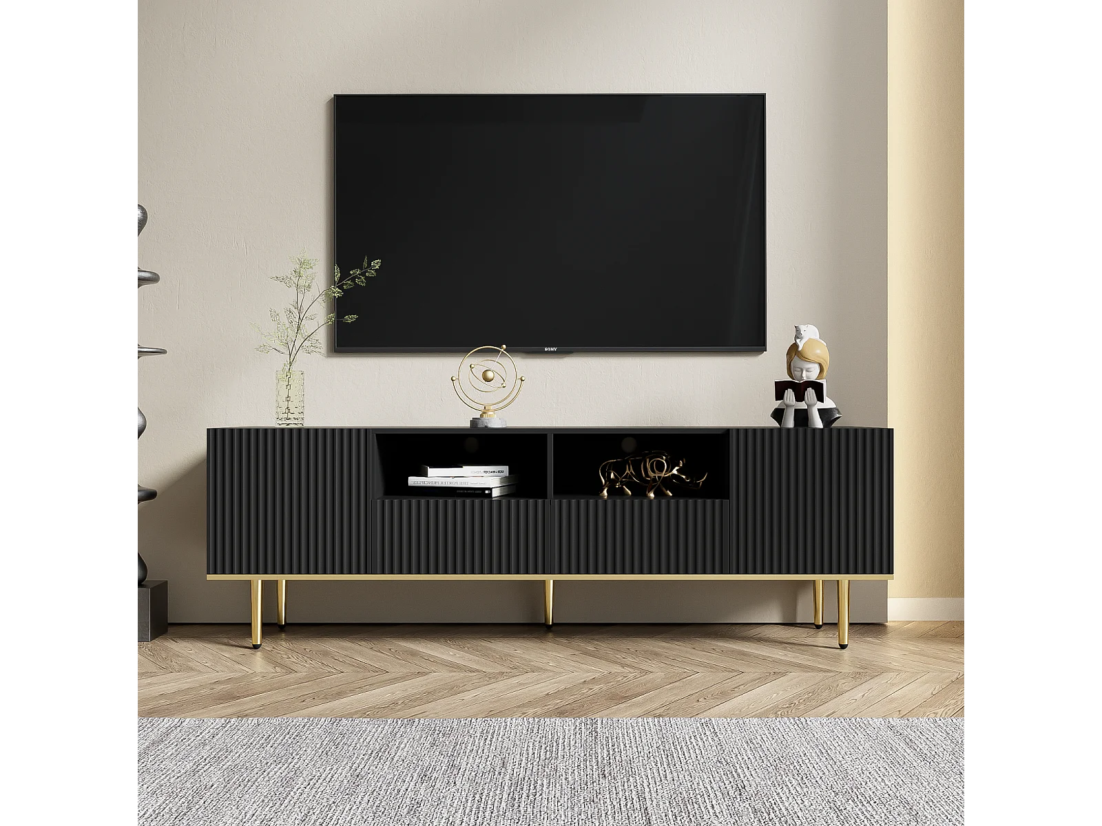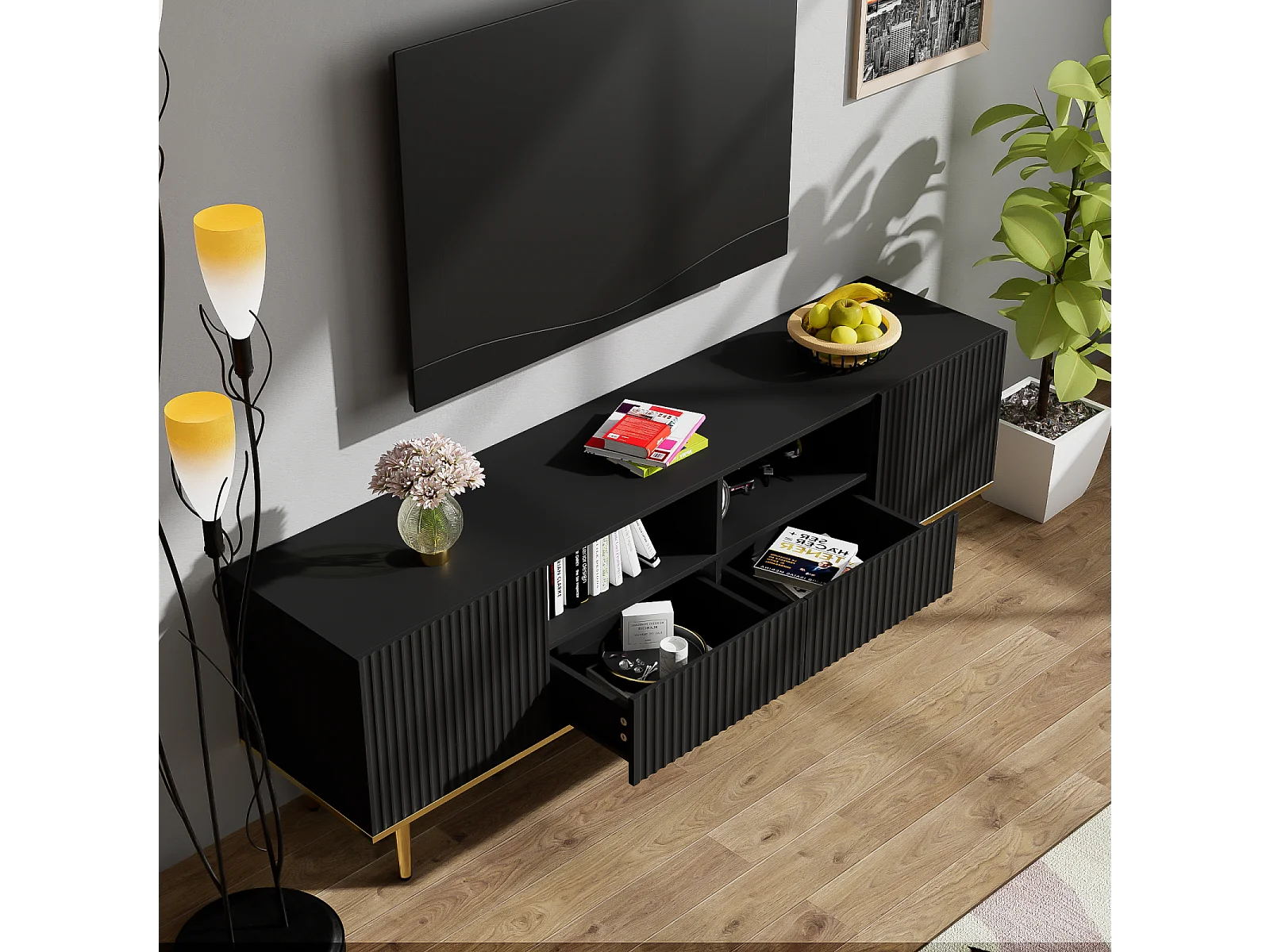 Móvel de TV 165x36x55 cm com armazenamento, 2 portas e 2 gavetas, Móvel de TV baixo, Pés dourados, Preto