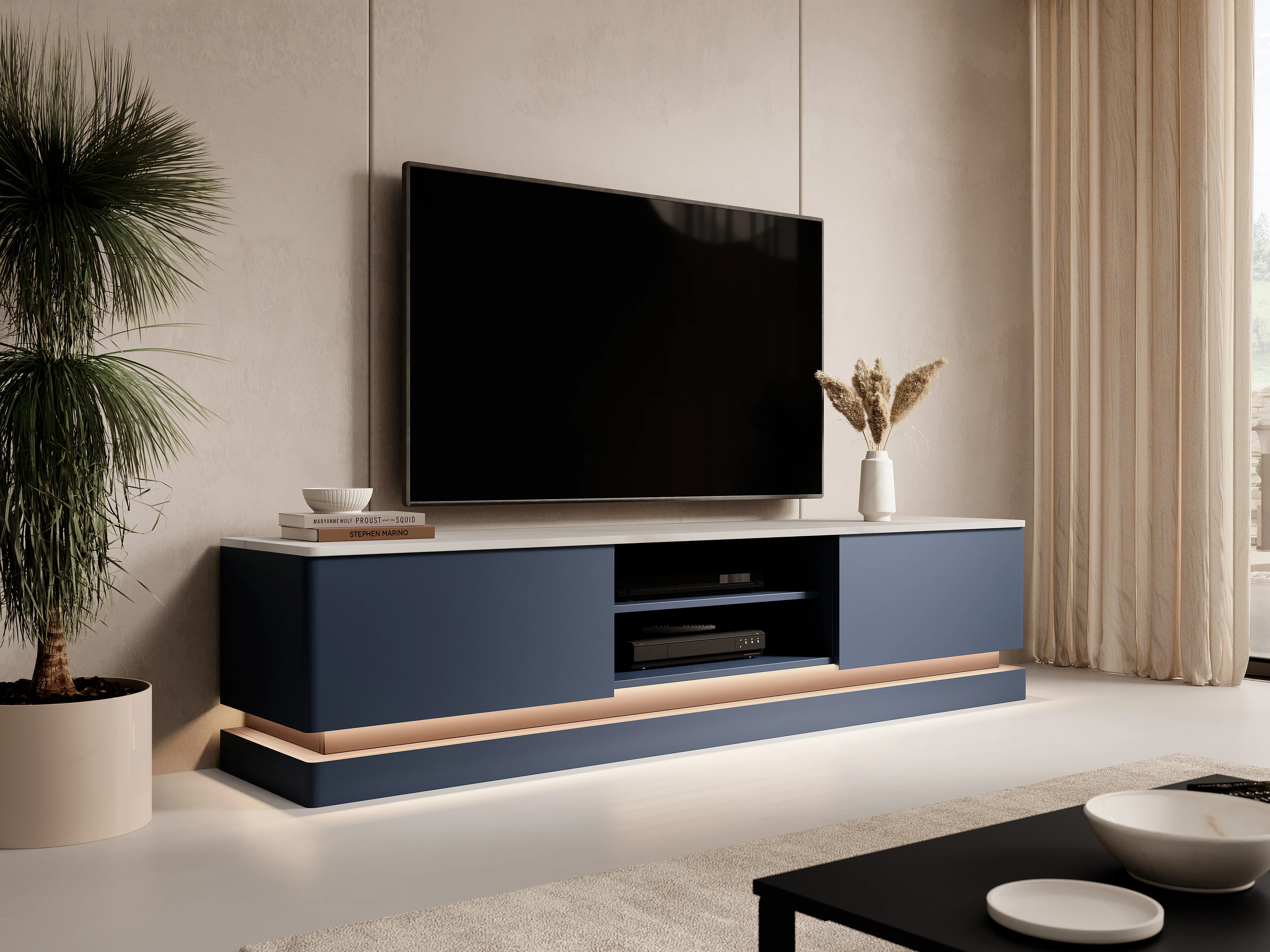 Móvel de TV 2 gavetas e 2 nichos com LEDs, MDF, azul e efeito mármore branco - DEVIKA de Pascal Morabito