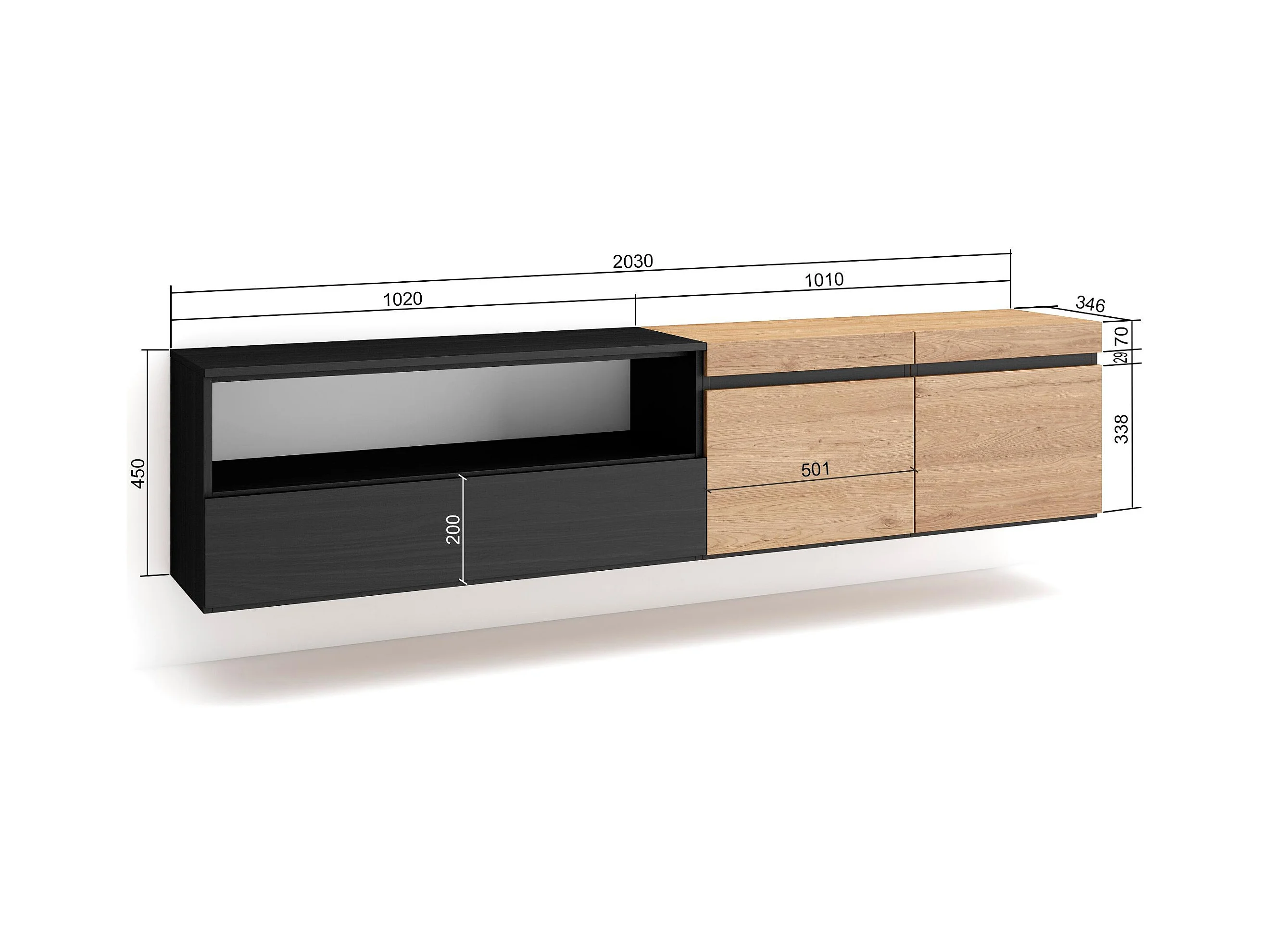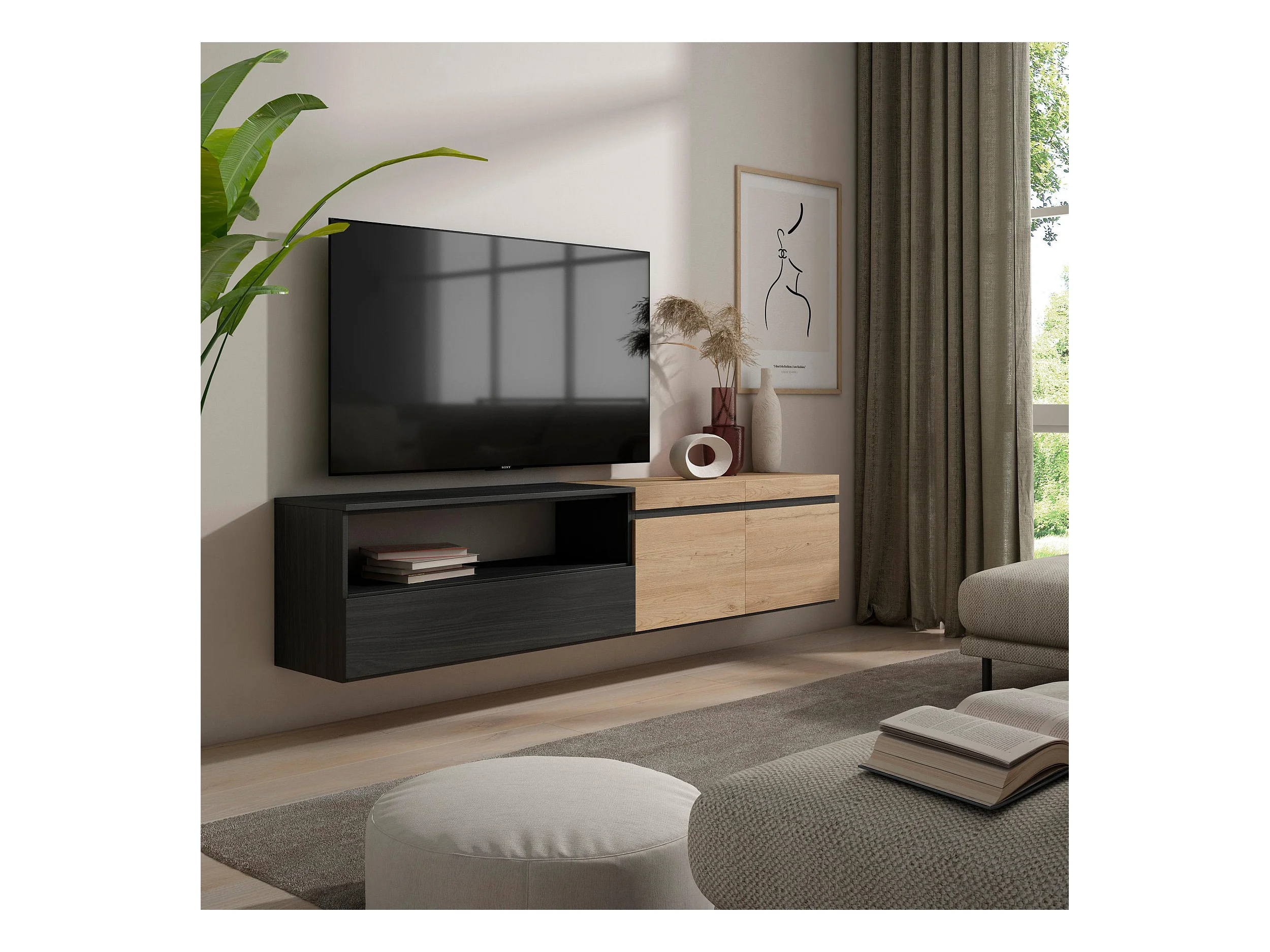 Móvel de TV, 200x35x45cm, Para televisores até 80", Suspensos, Carvahlo e preto