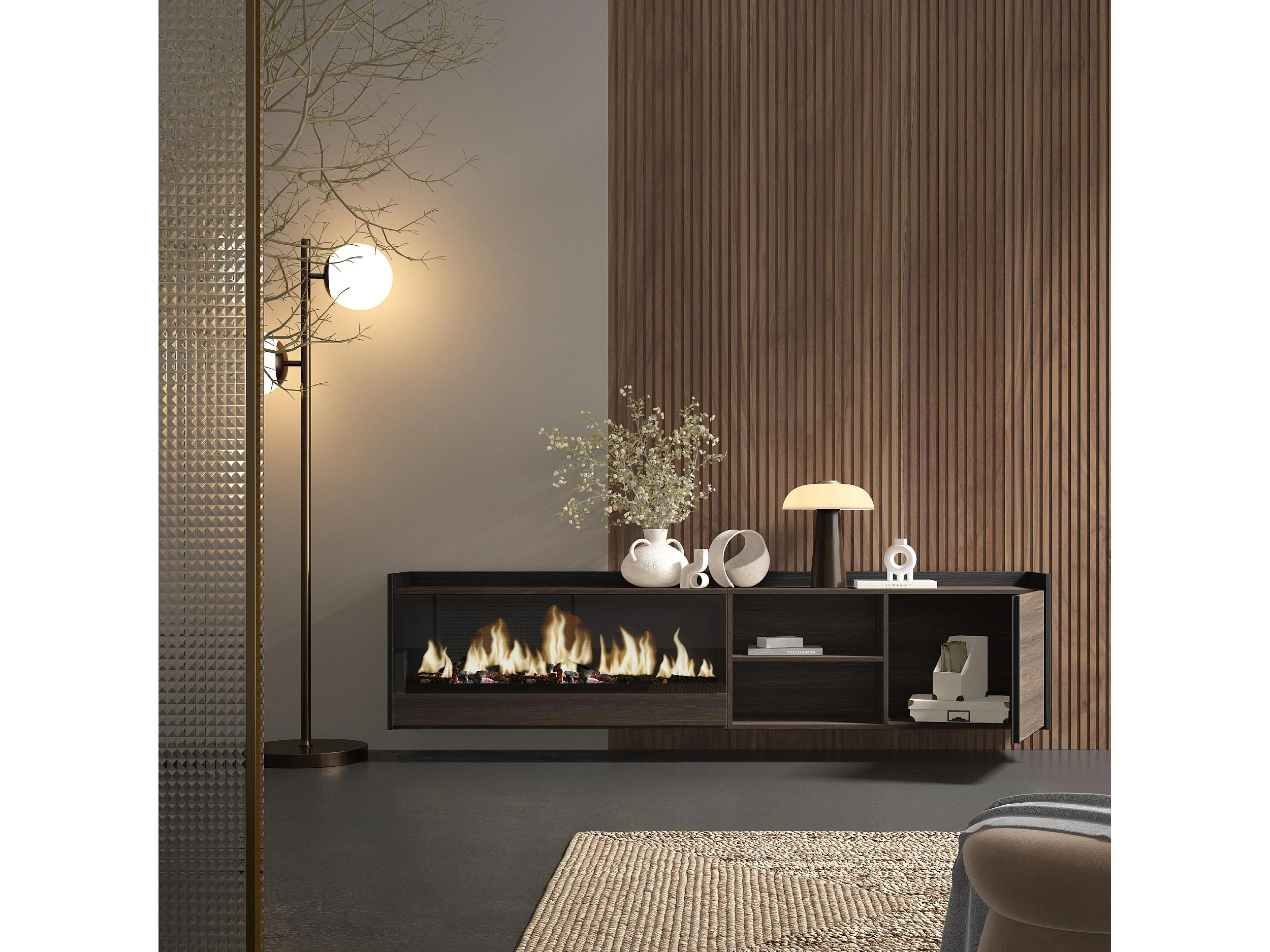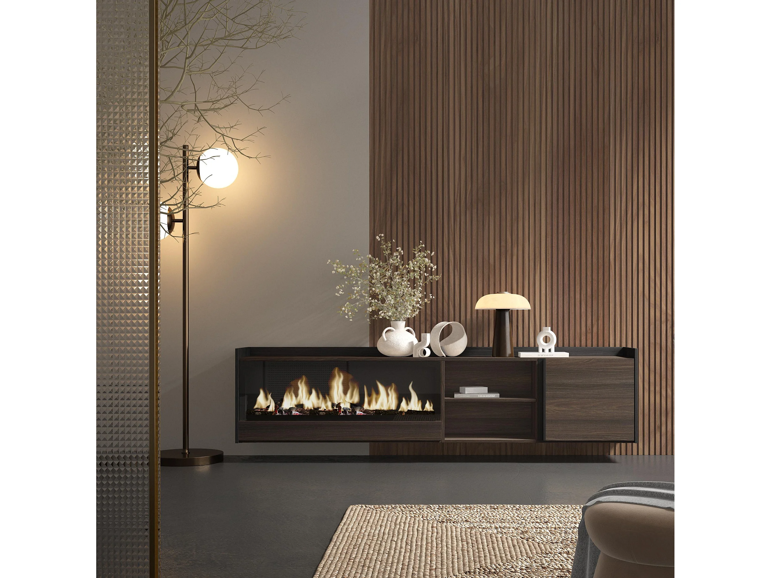 Móvel de TV, 212x50x35 cm, Para televisores até 80", Lareira eléctrica XXL, Suspensos, Carvalho escuro e Preto