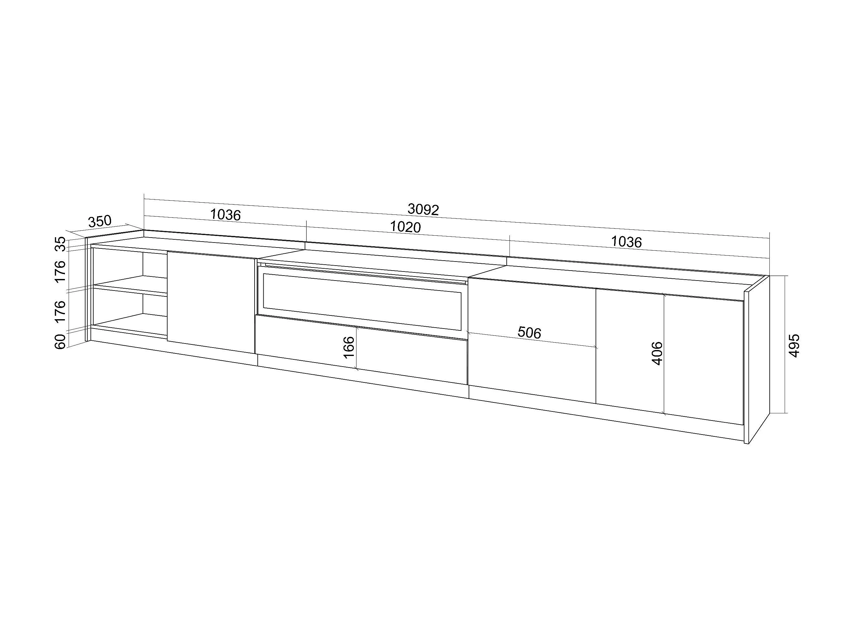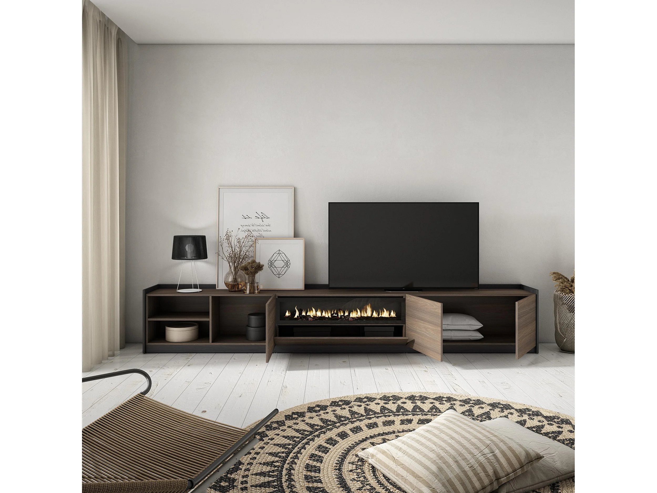 Móvel de TV, 310x50x37 cm, Para televisores até 80", Lareira eléctrica, Carvalho escuro e Preto