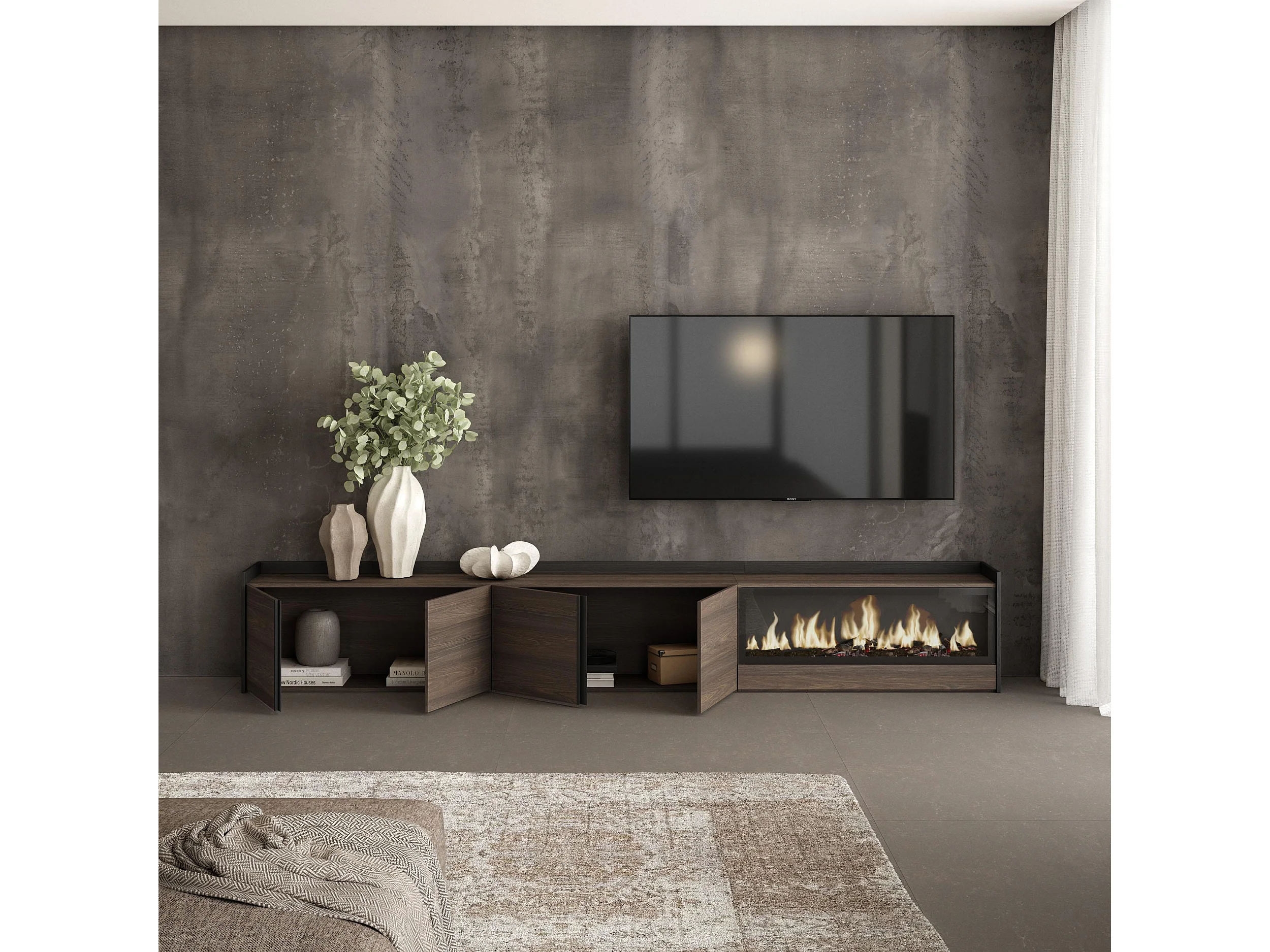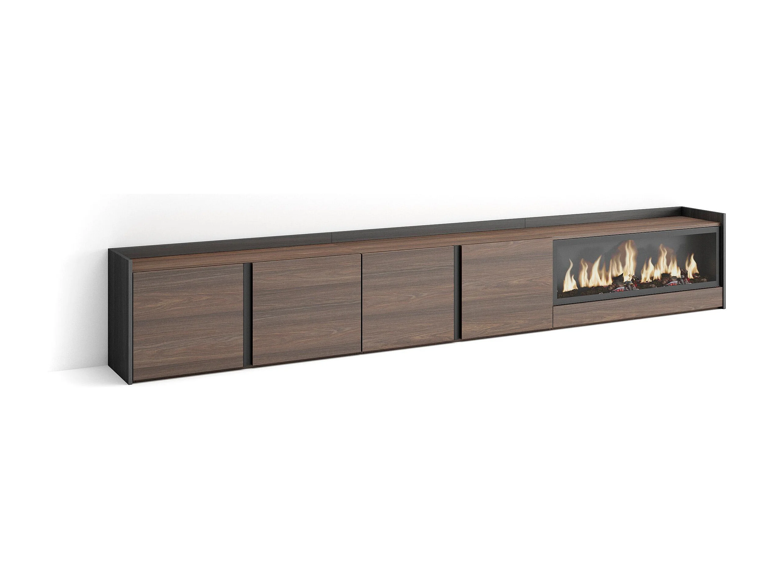 Móvel de TV, 315x50x35 cm, Para televisores até 80", Lareira eléctrica XXL, Carvalho escuro e Preto
