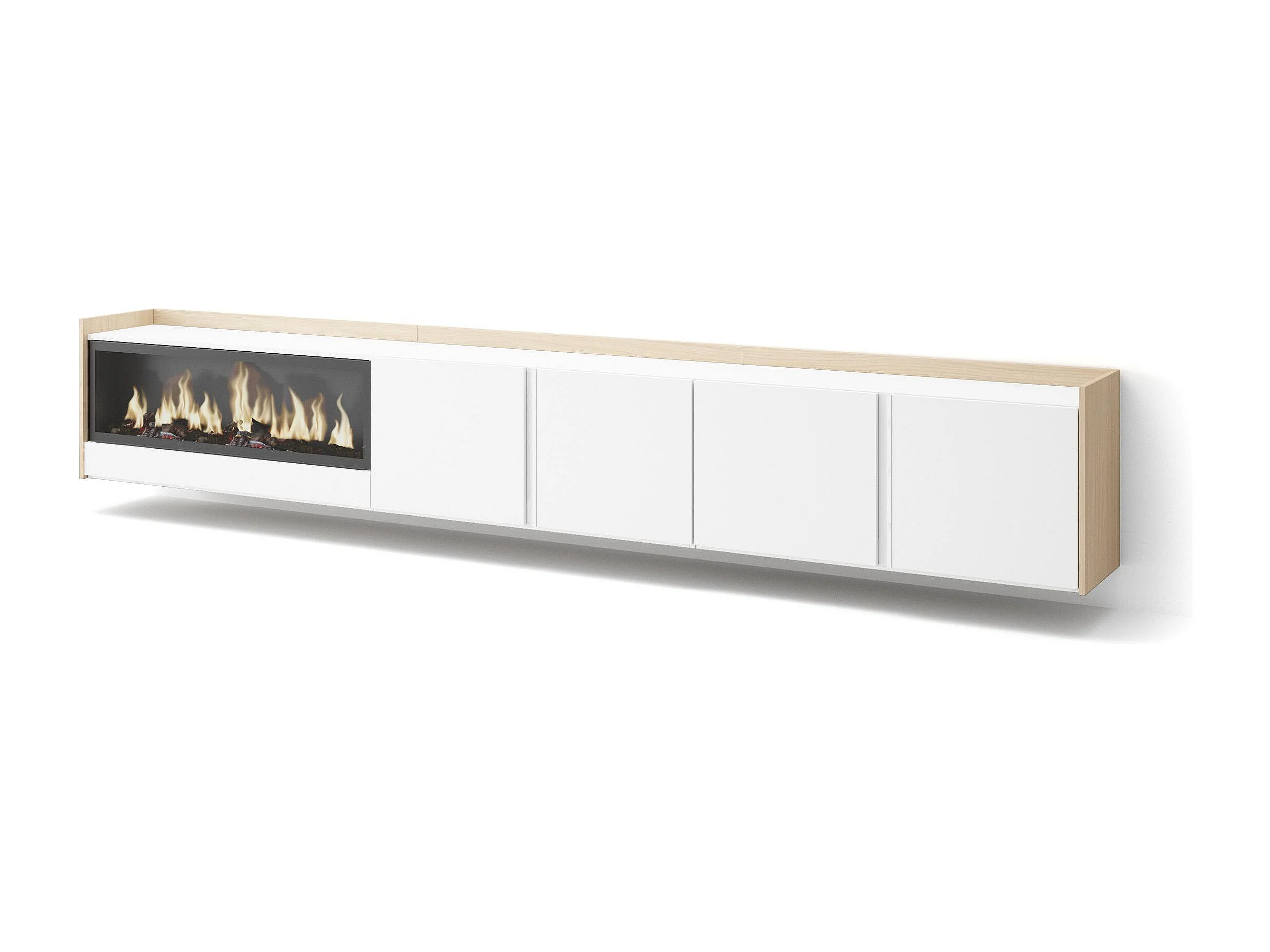 Móvel de TV, 315x50x35 cm, Para televisores até 80", Lareira eléctrica XXL, Suspensos, Branco e Carvalho soft