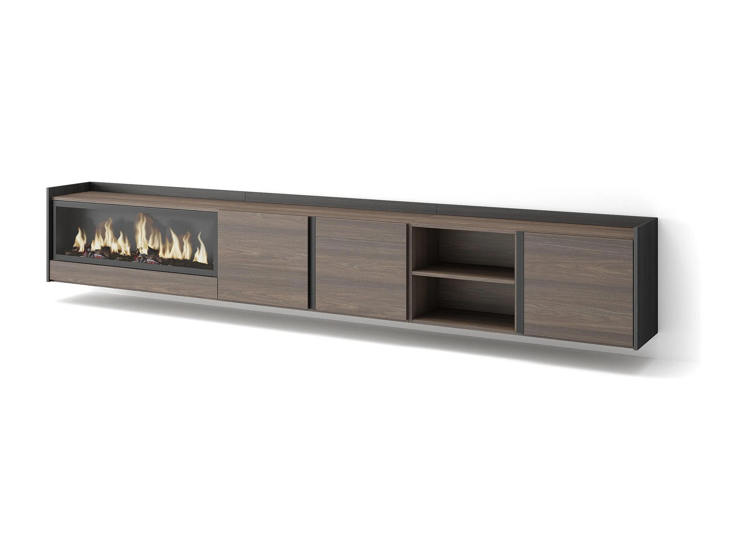 Móvel de TV, 315x50x35 cm, Para televisores até 80", Lareira eléctrica XXL, Suspensos, Carvalho escuro e Preto