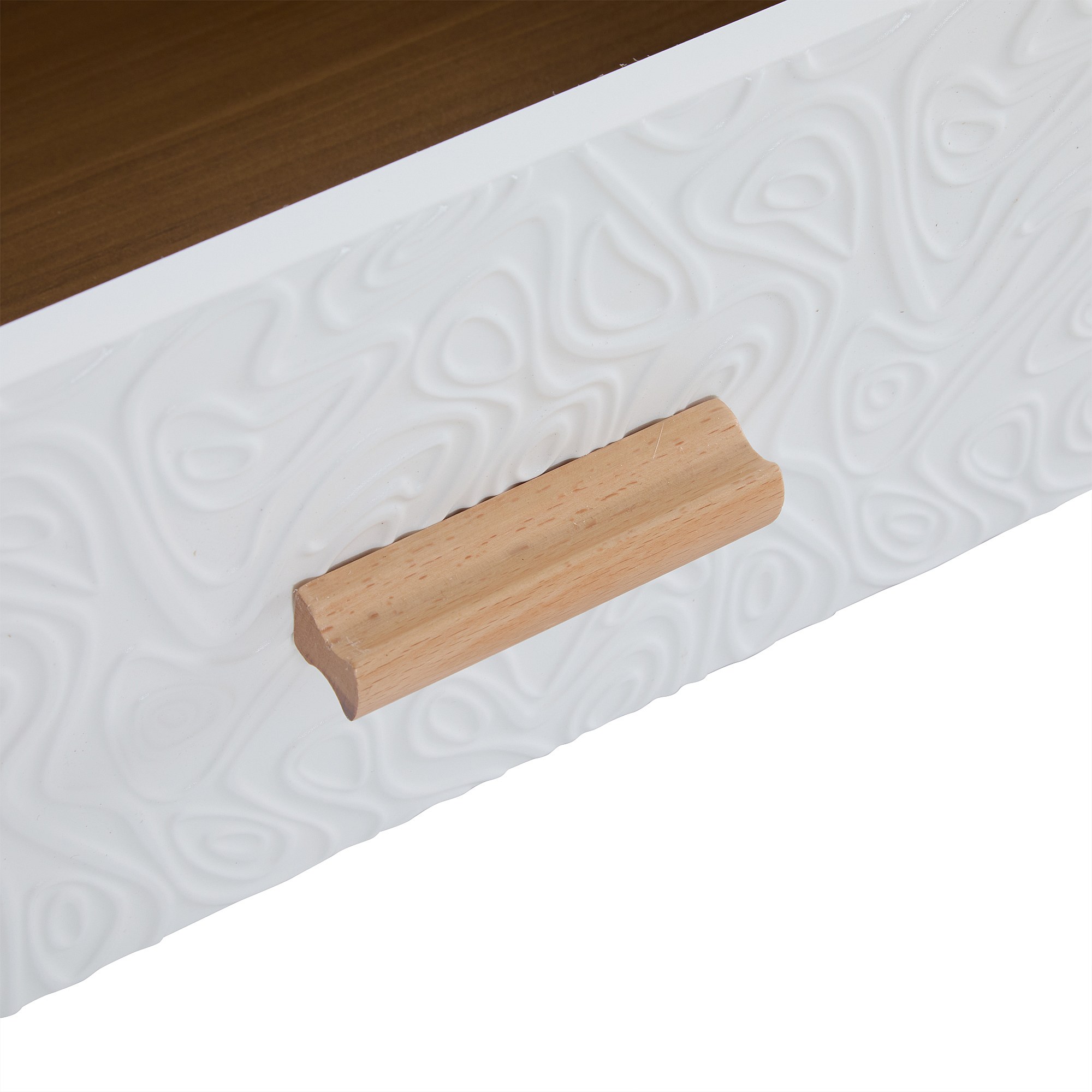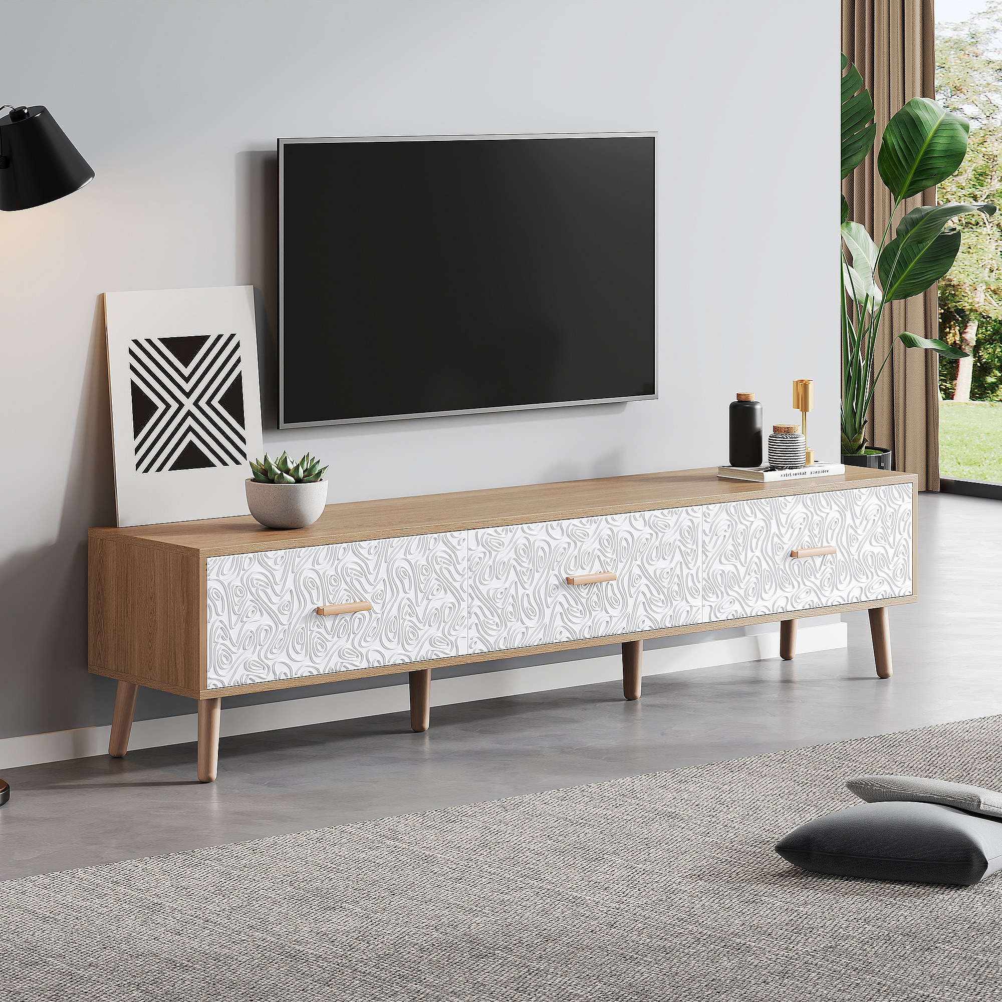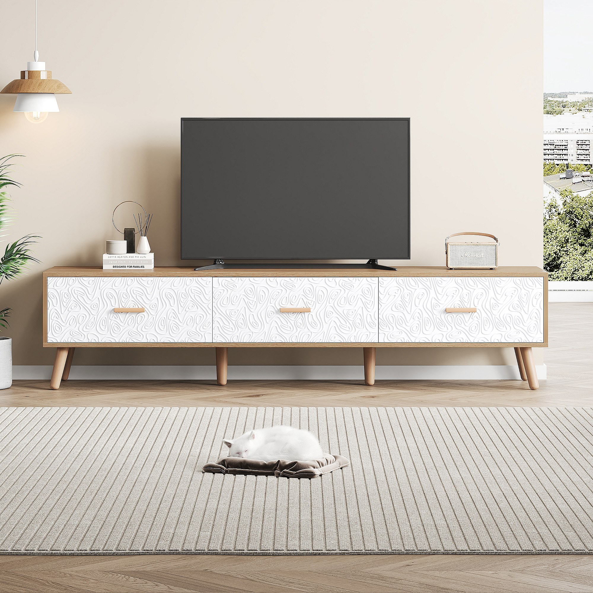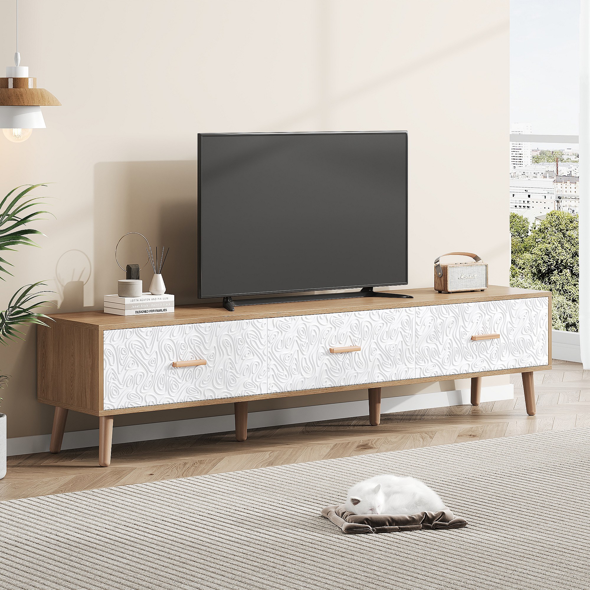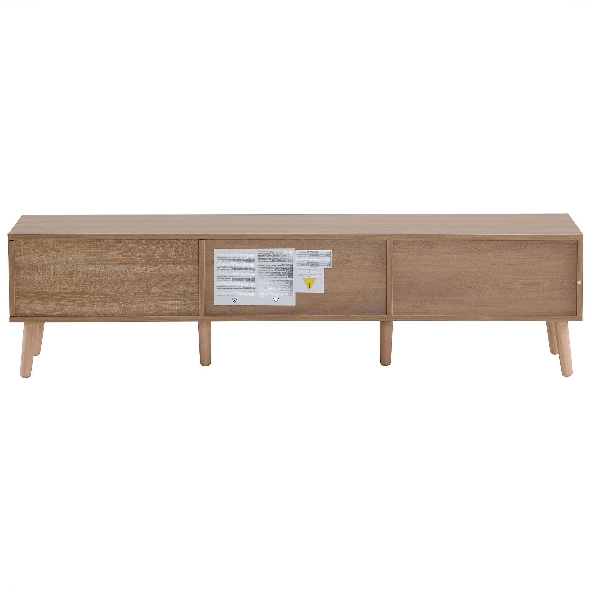 Móvel de TV baixo de madeira vintage - Para sala de estar, madeira clara, revestimento de porta branco, grão vintage