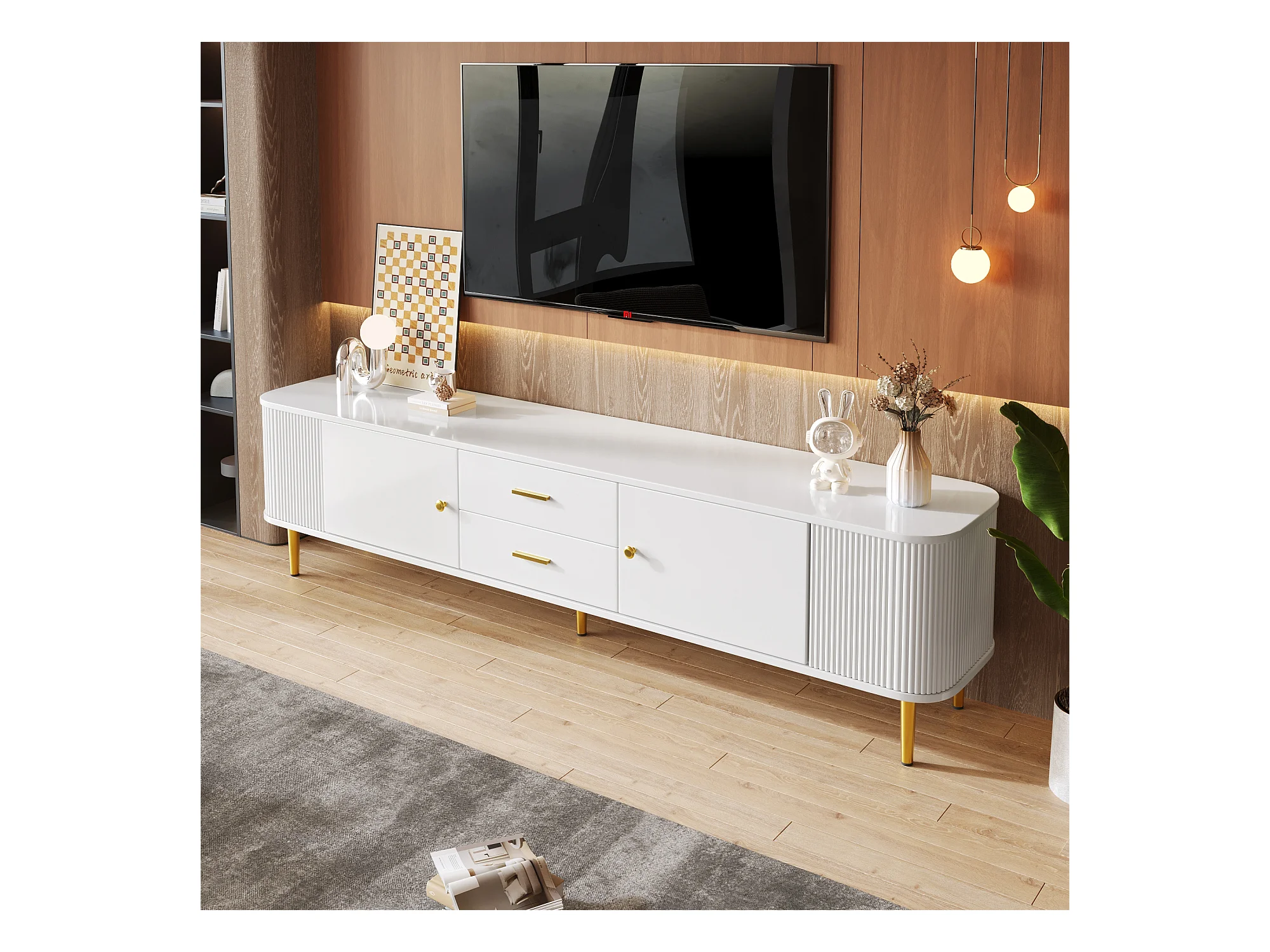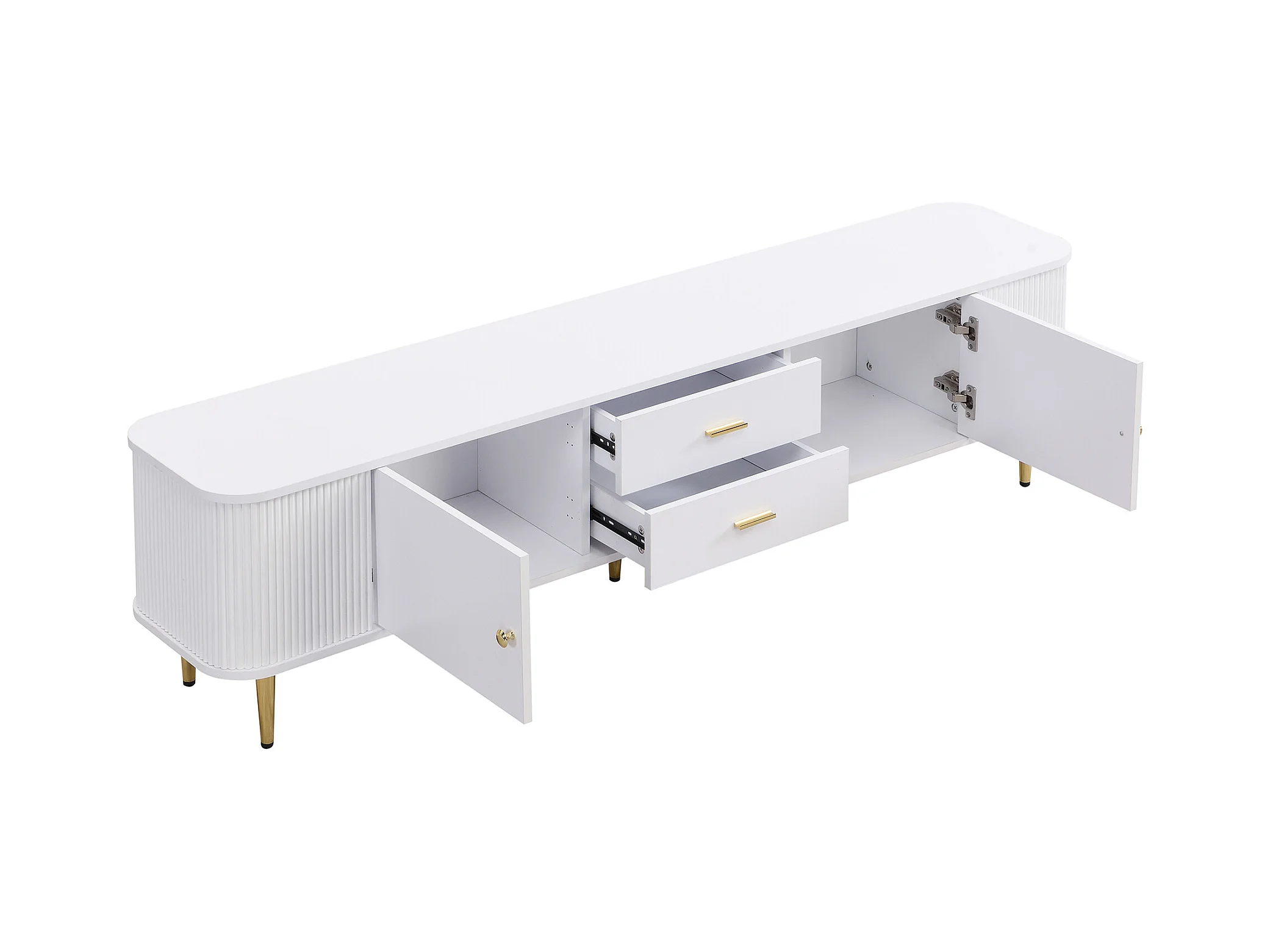 Móvel de TV baixo moderno com gavetas e laterais onduladas, bordas curvas, com puxadores e pés dourados