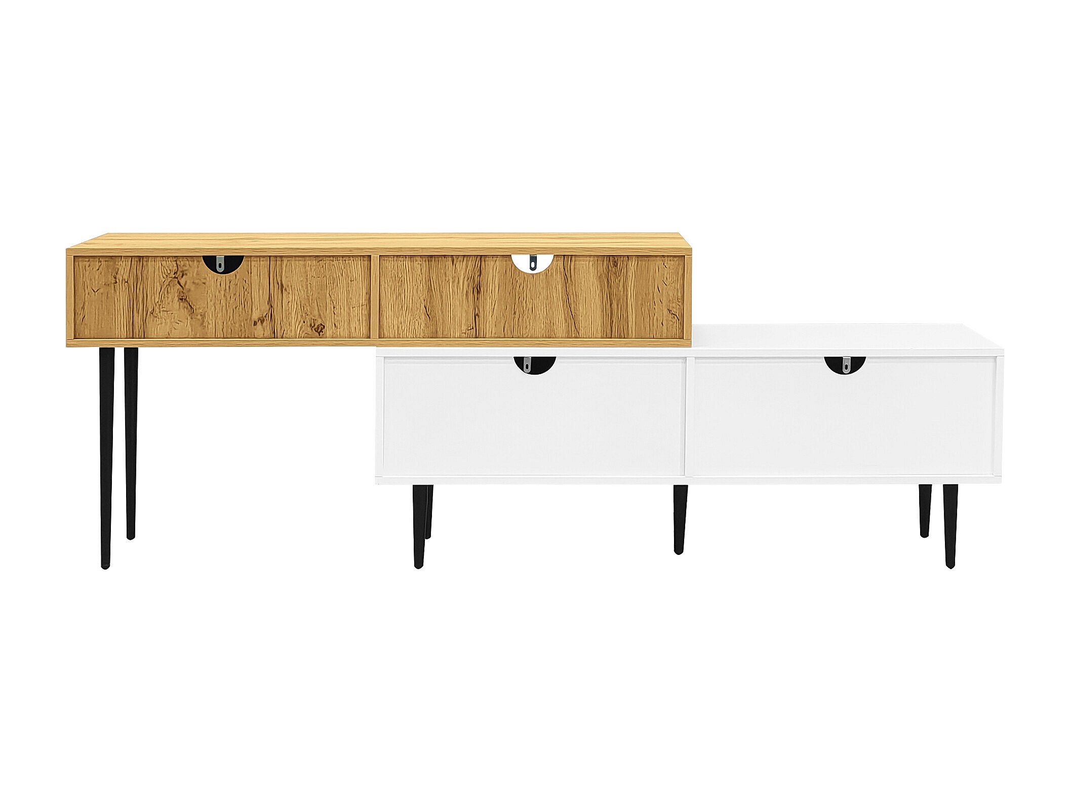 Móvel de TV branco e madeira com 3 portas, modular em 2 partes, pés pretos