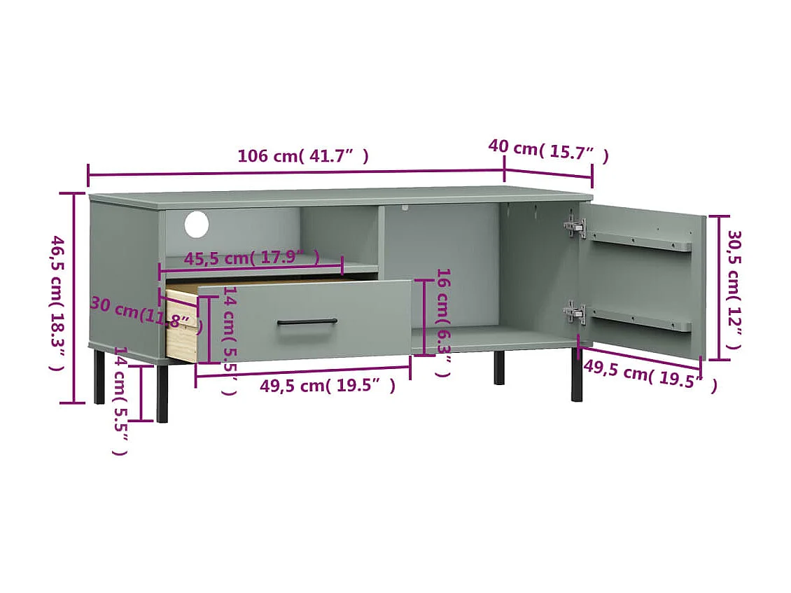 Móvel de TV c/ pernas de metal OSLO pinho maciço cinzento