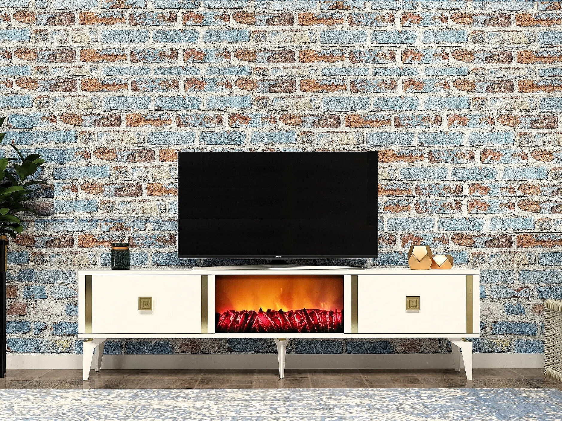 Móvel de TV com Lareira Elétrica – 150 cm – Branco e Dourado – Melamina