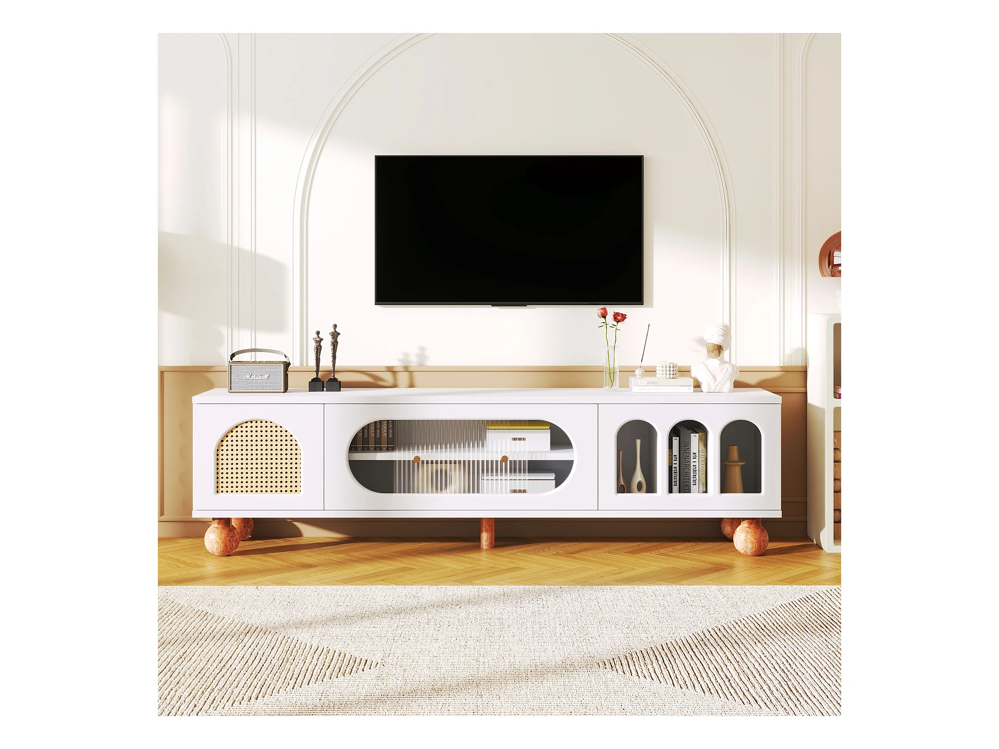 Móvel de TV de 170 cm em madeira e branco com portas de vime e vidro, gavetas e pés maciços