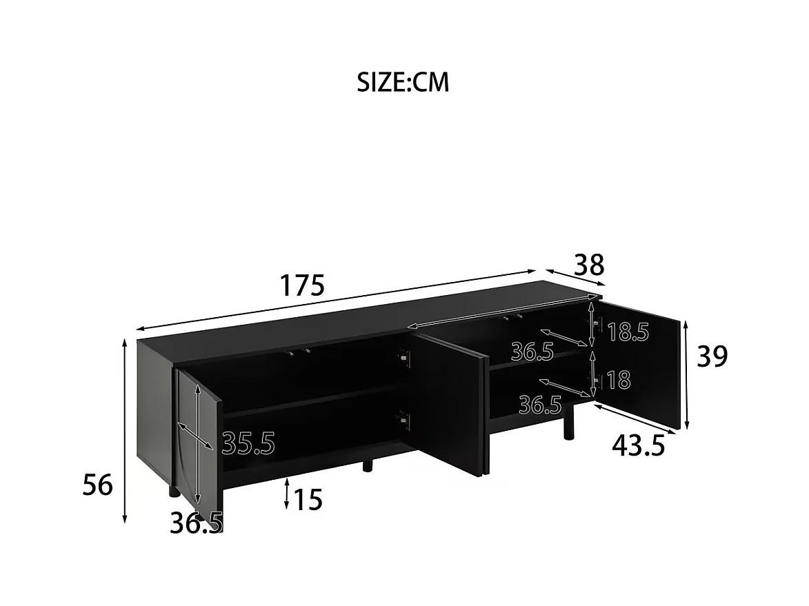 Móvel de TV em madeira MDF de 175 cm com armazenamento ajustável, design moderno preto para sala de estar