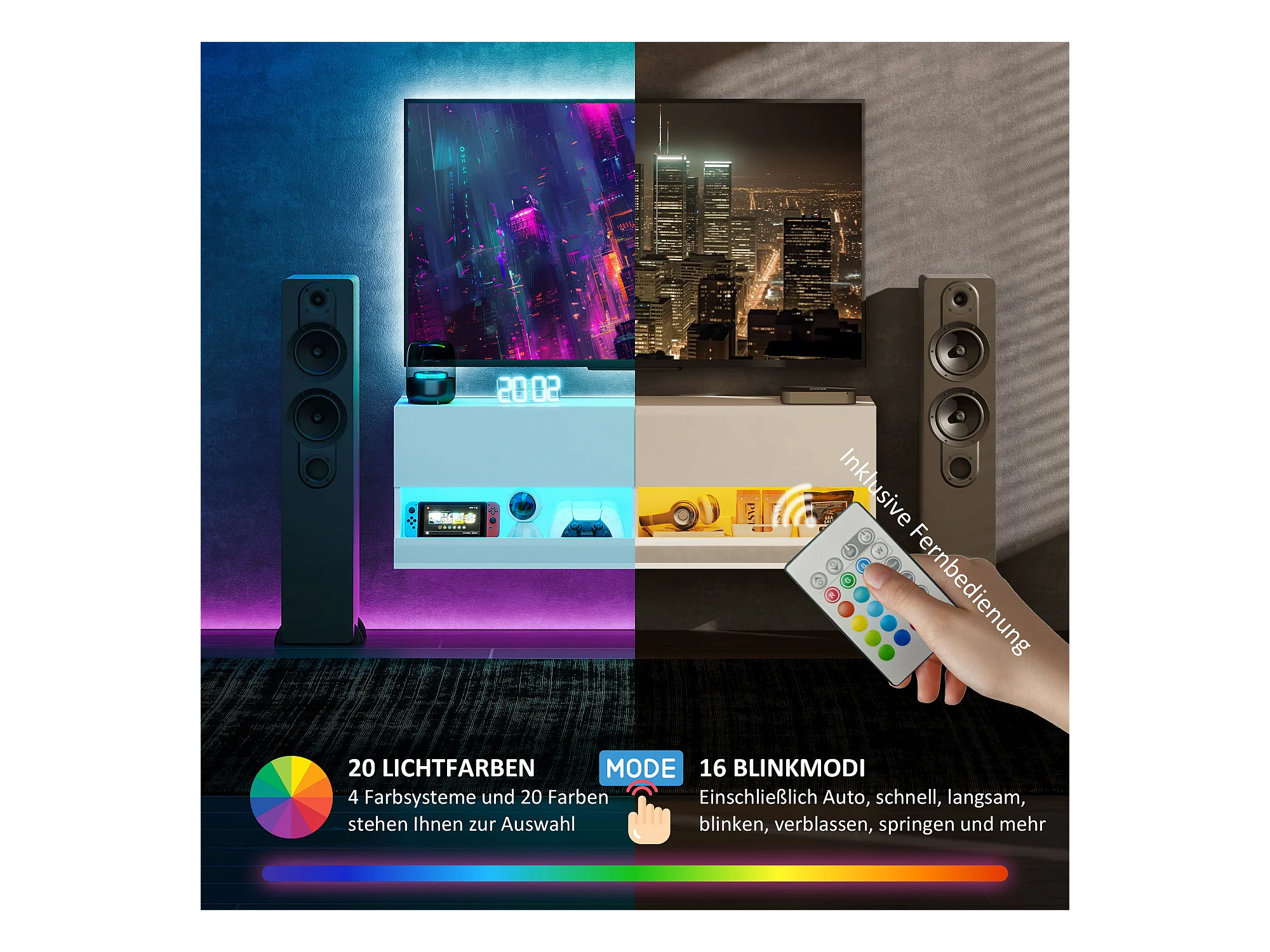 Móvel de TV de parede em MDF 120 cm, lacado a branco, LED, 16 modos de arrumação para sala de estar