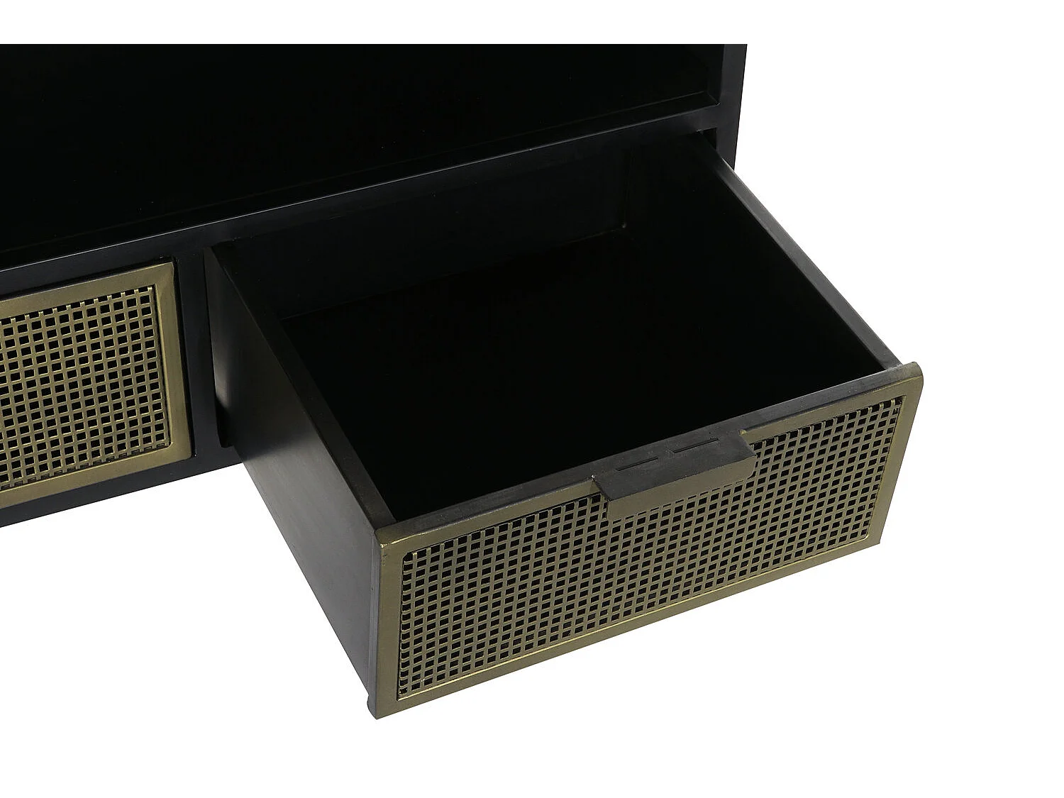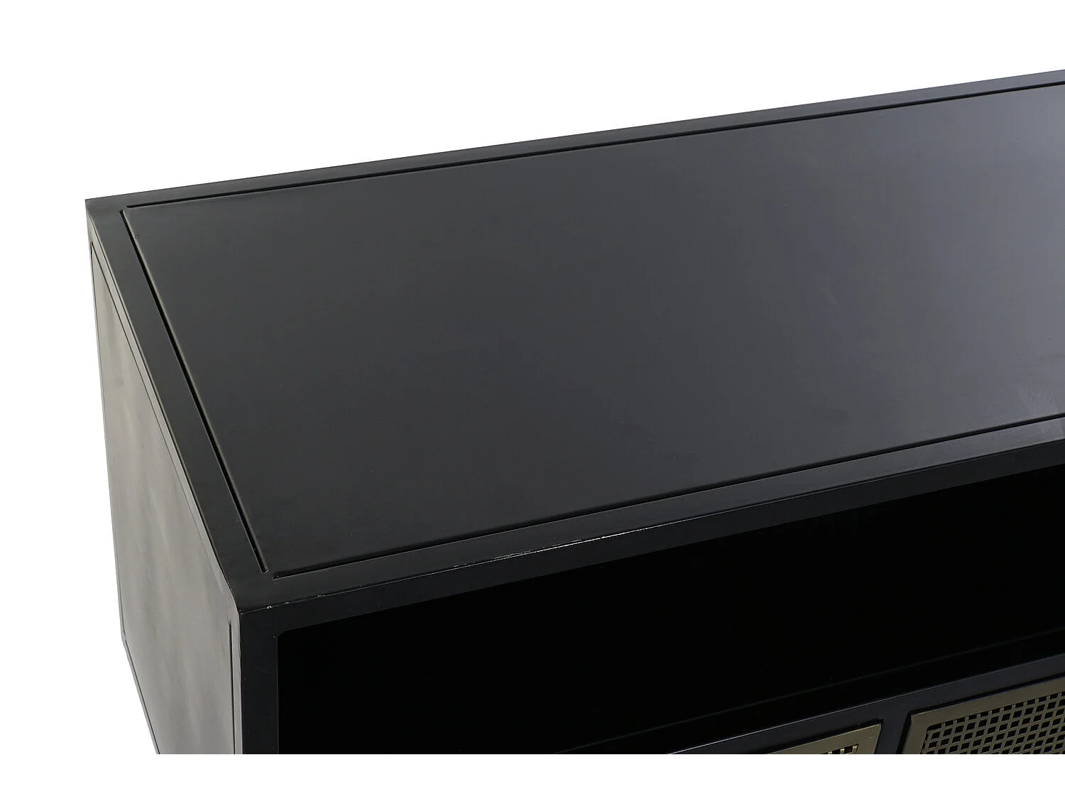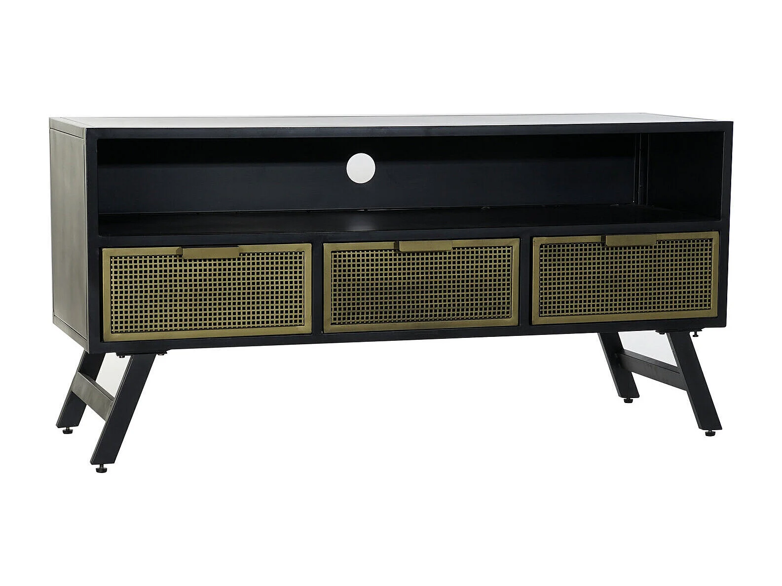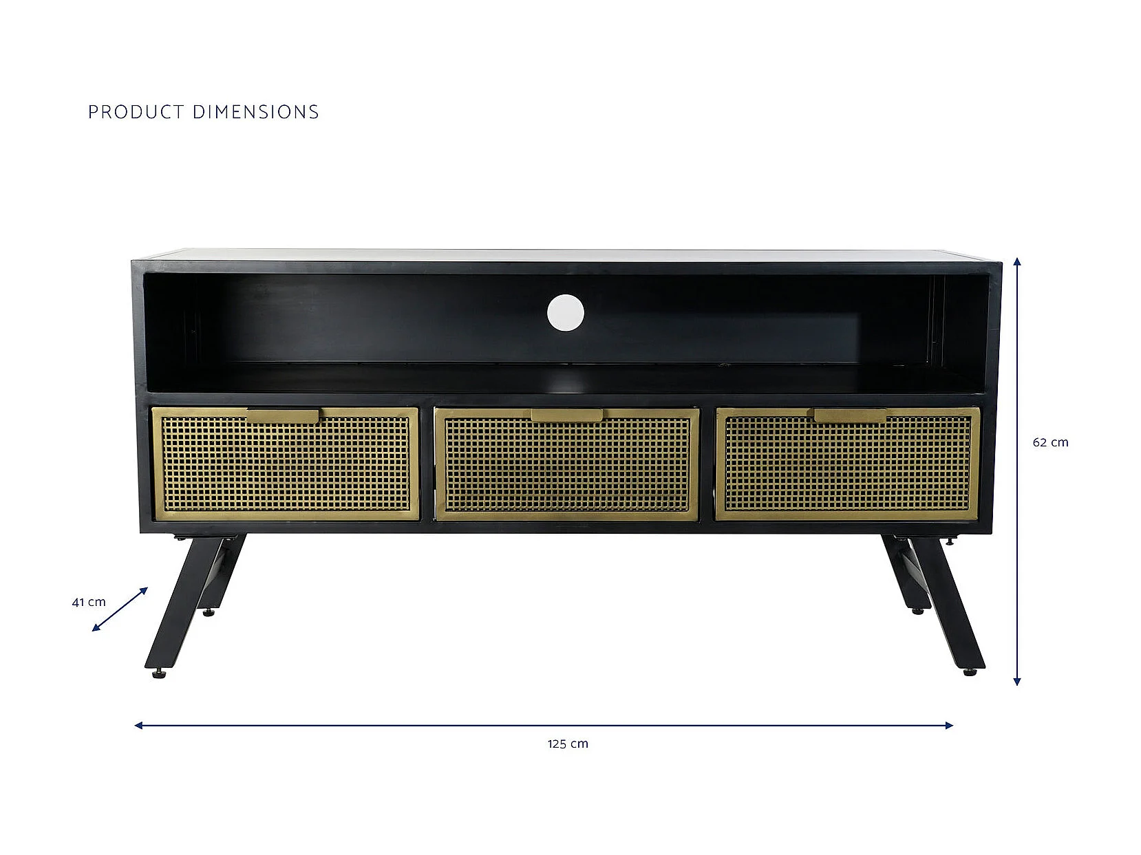 Móvel de TV em metal, 125 x 41 x 62 cm, tela preta.