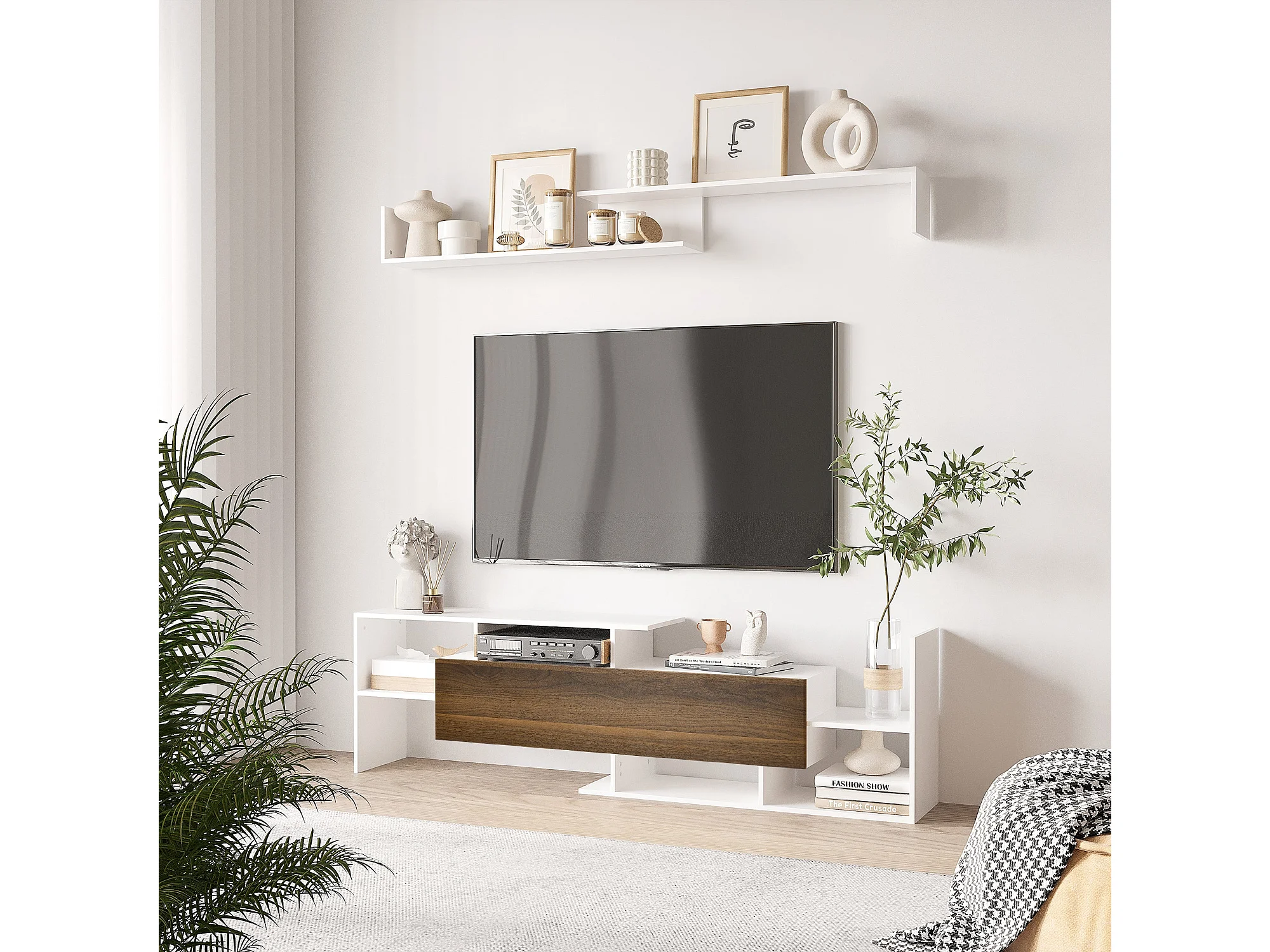 Móvel de TV Moderno com Prateleiras para Sala de Estar em Branco e Marrom
