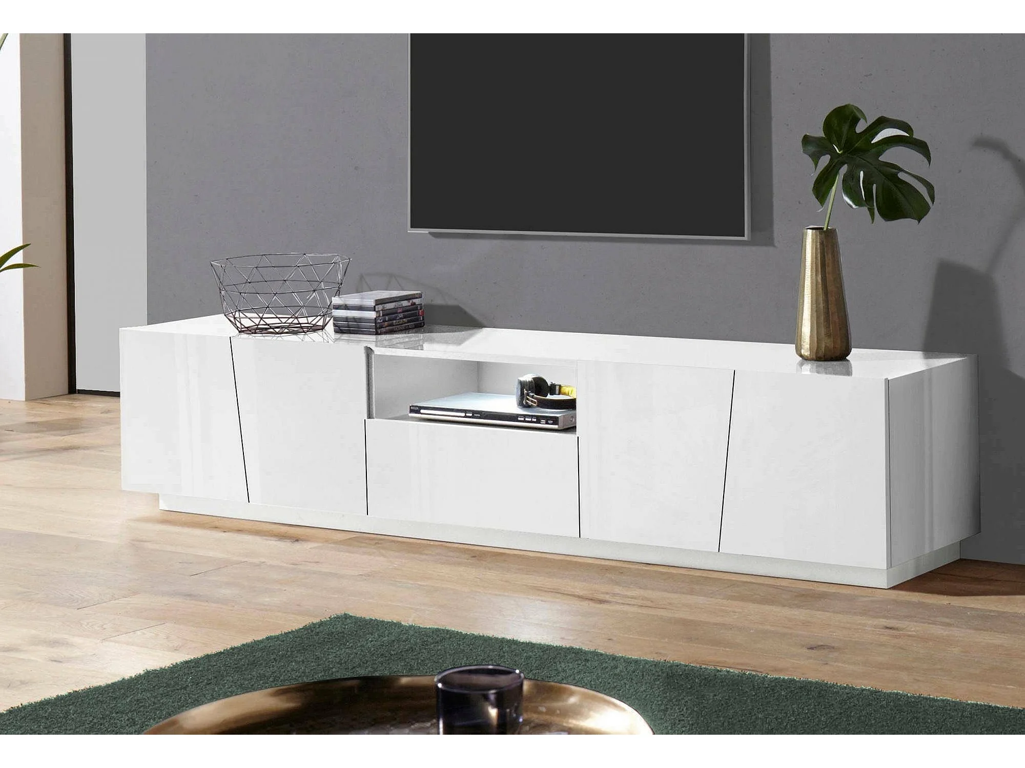 Móvel de TV Paul, Aparador baixo de sala, Base de móvel de televisão, 100% Fabricado na Itália, 220x43h46 cm, Branco brilhante, com luz LED