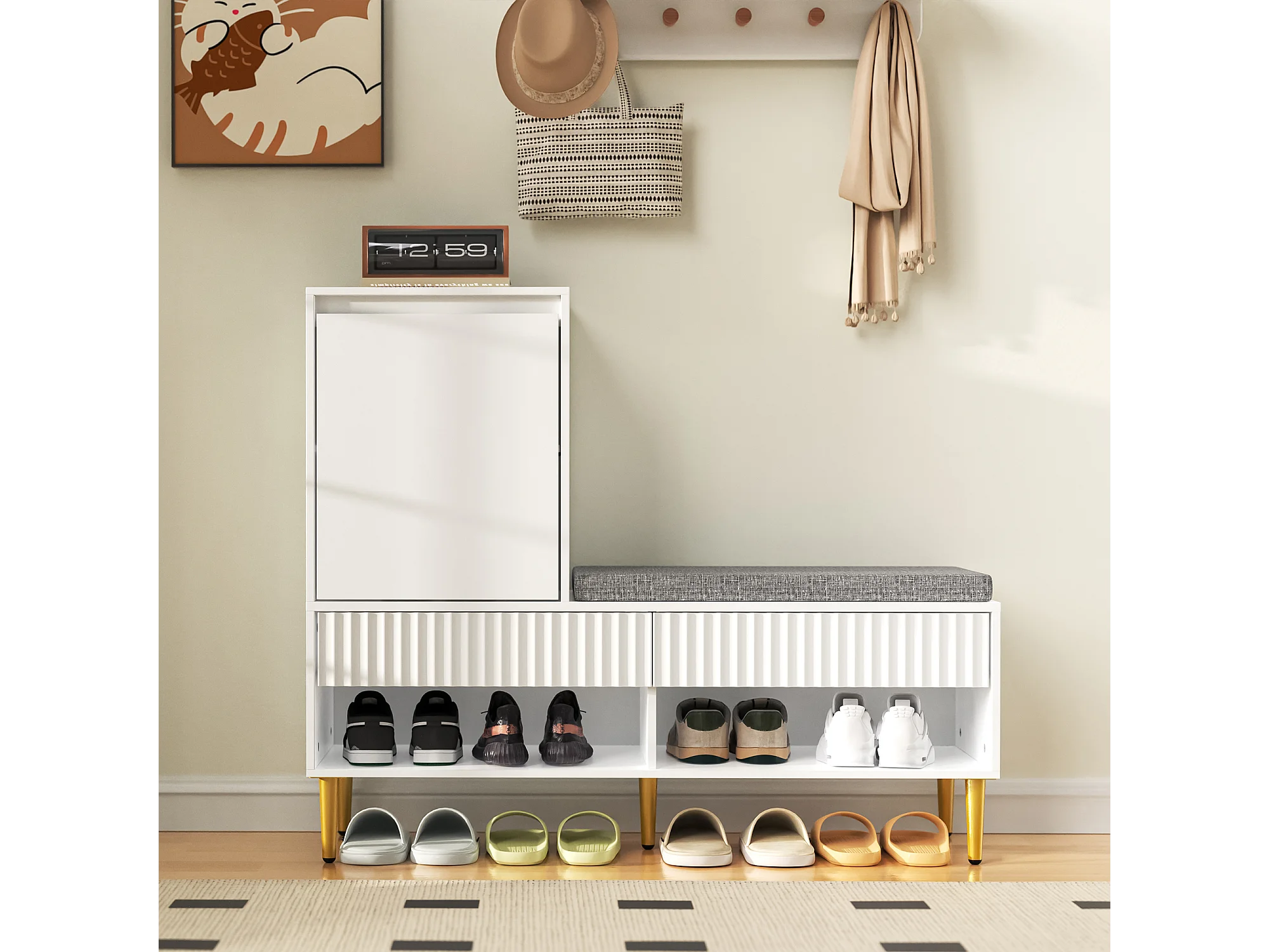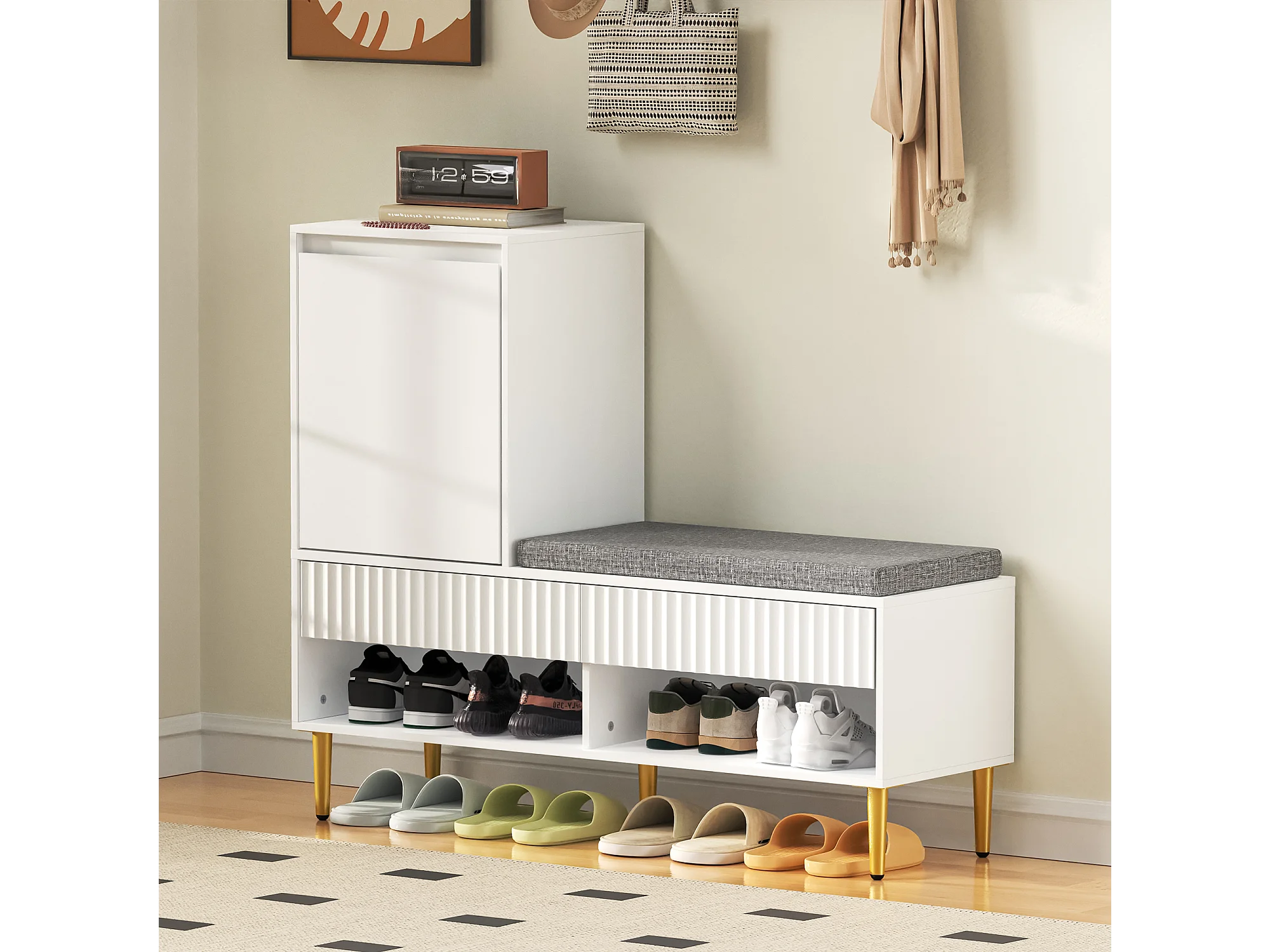 Móvel para sapatos 100x35x90cm - com banco - com 2 gavetas e 1 porta - prateleiras abertas - Branco