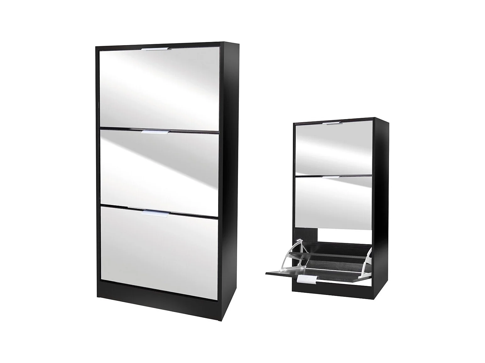 Móvel para sapatos estilo design na cor preta com fachada espelhada, dimensões 60x24x116cm.
