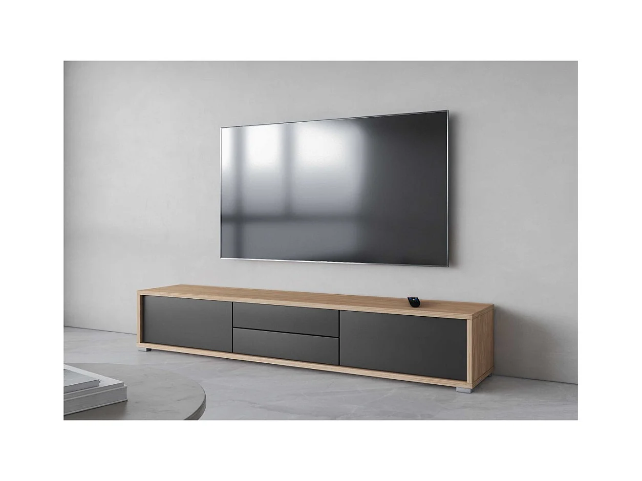 Móvel para TV 180cm, 2 gavetas e 2 portas coleção MAANUM. Cor carvalho claro e cinza.