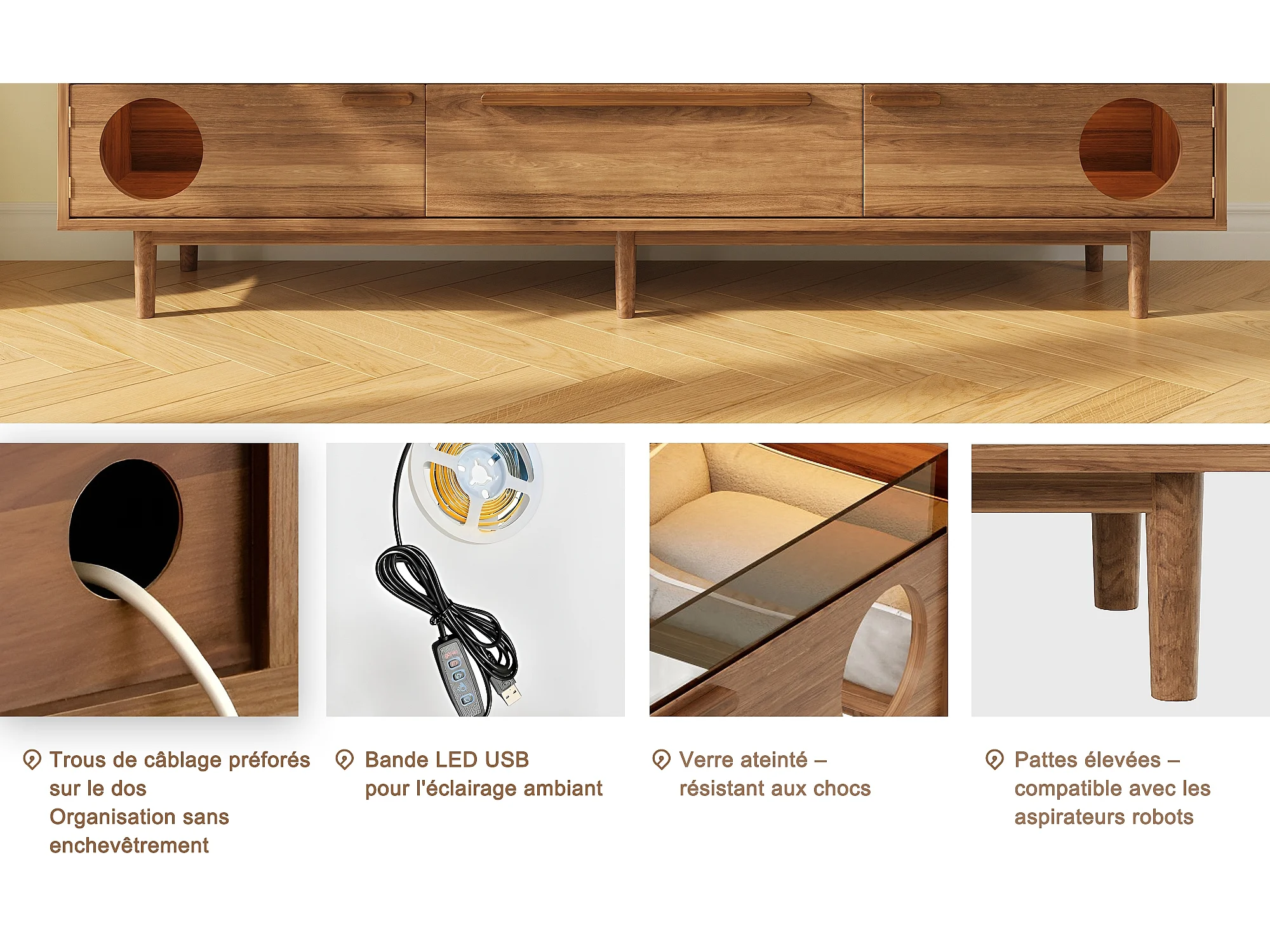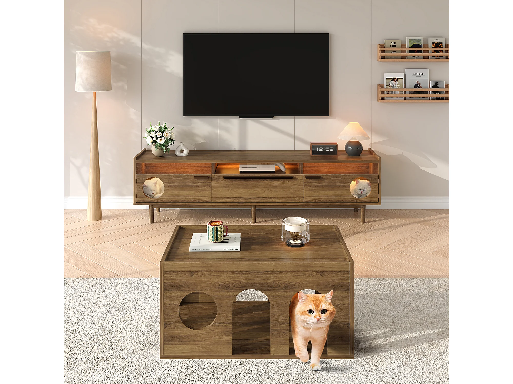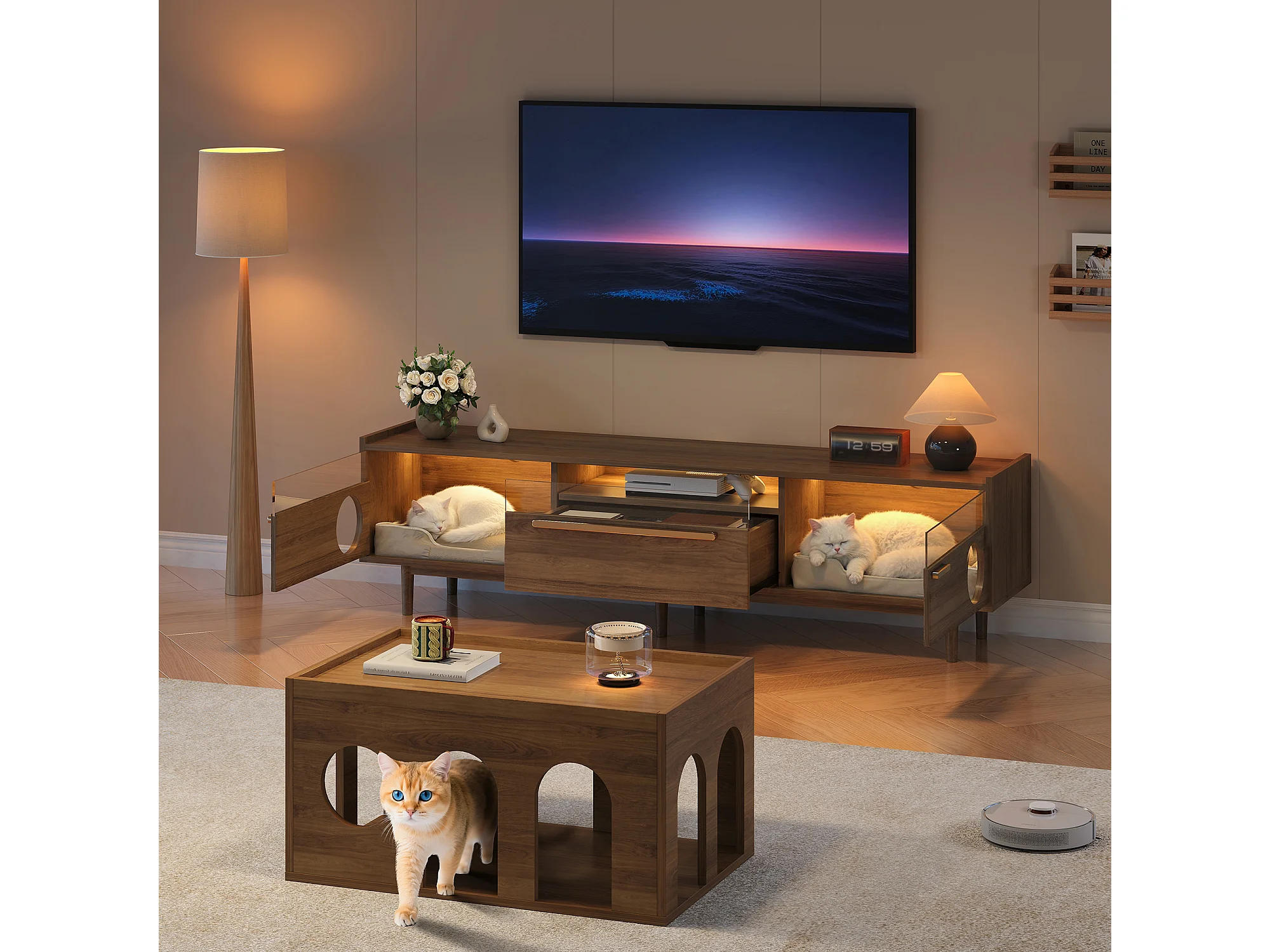 Móvel para TV 180×40×50 cm na cor nogueira, com iluminação LED, portas de vidro, gaveta e área de descanso para gatos, ideal para sala de estar.