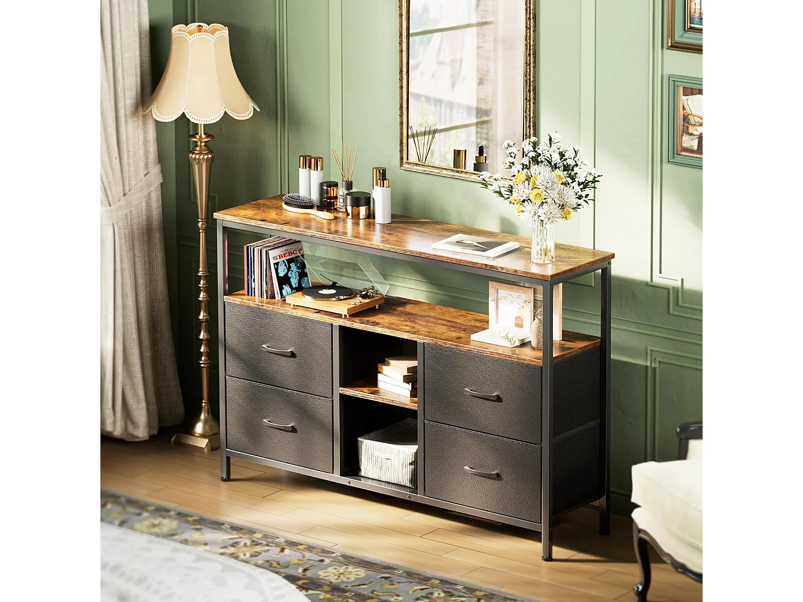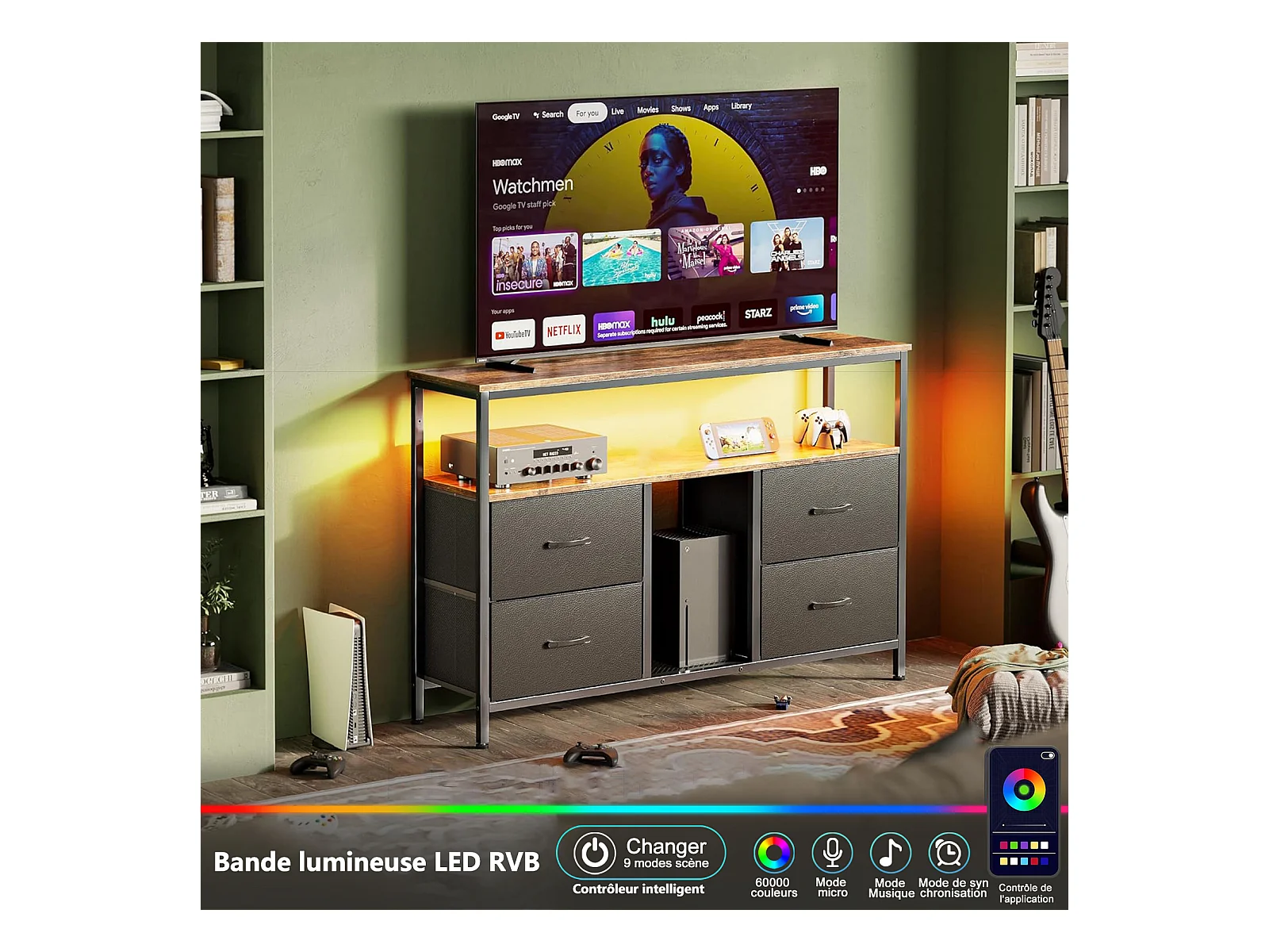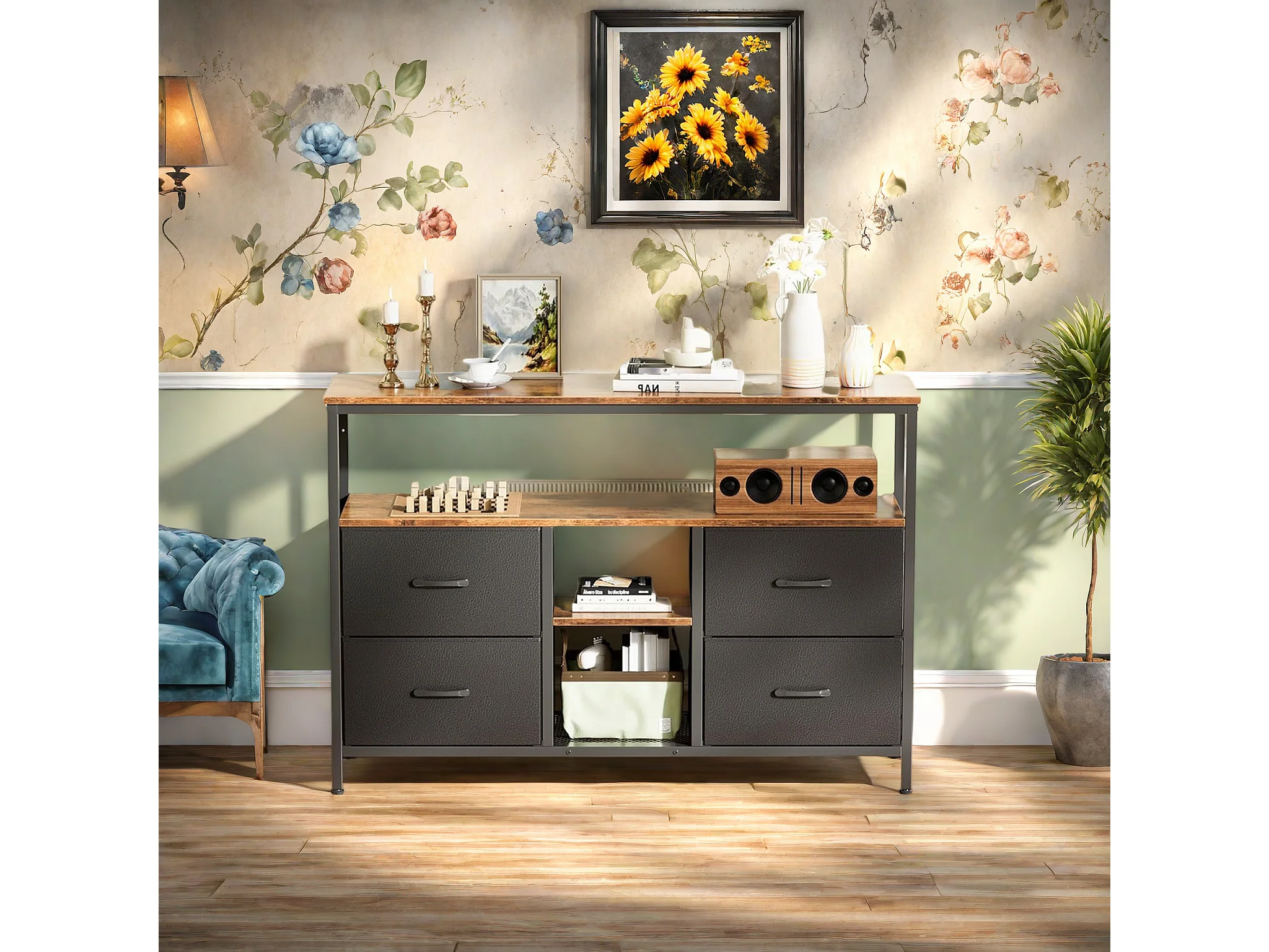 Móvel para TV até 108 cm com LED, tampo efeito madeira de tigre, 4 gavetas em tecido PU preto e estrutura metálica robusta – estilo retrô moderno
