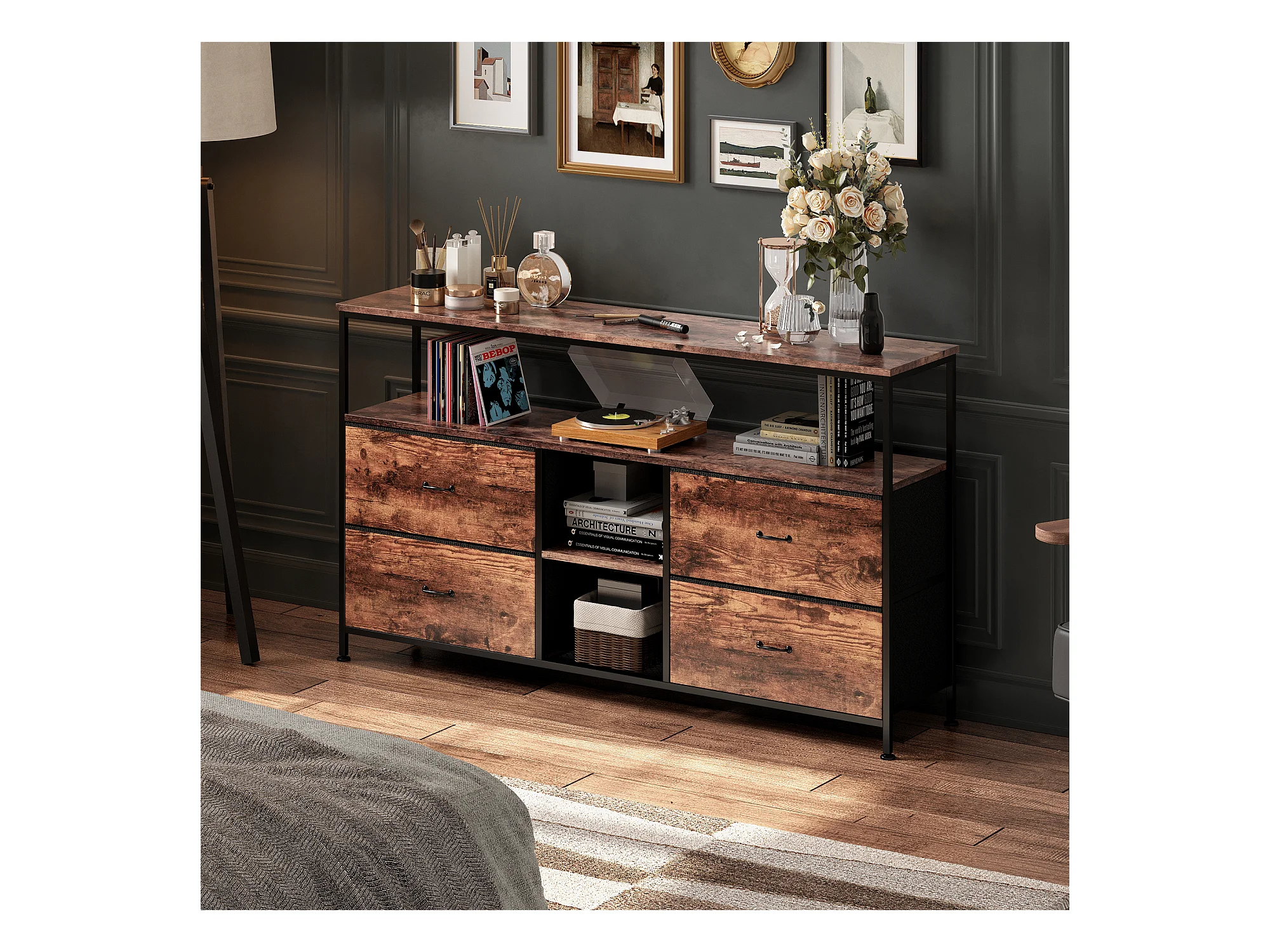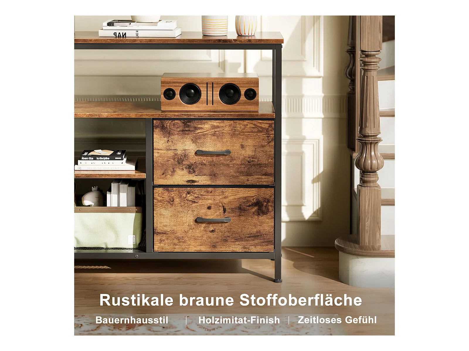 Móvel para TV até 108 cm com tampo efeito madeira de tigre, 4 gavetas de tecido vintage e estrutura metálica robusta – design retrô moderno