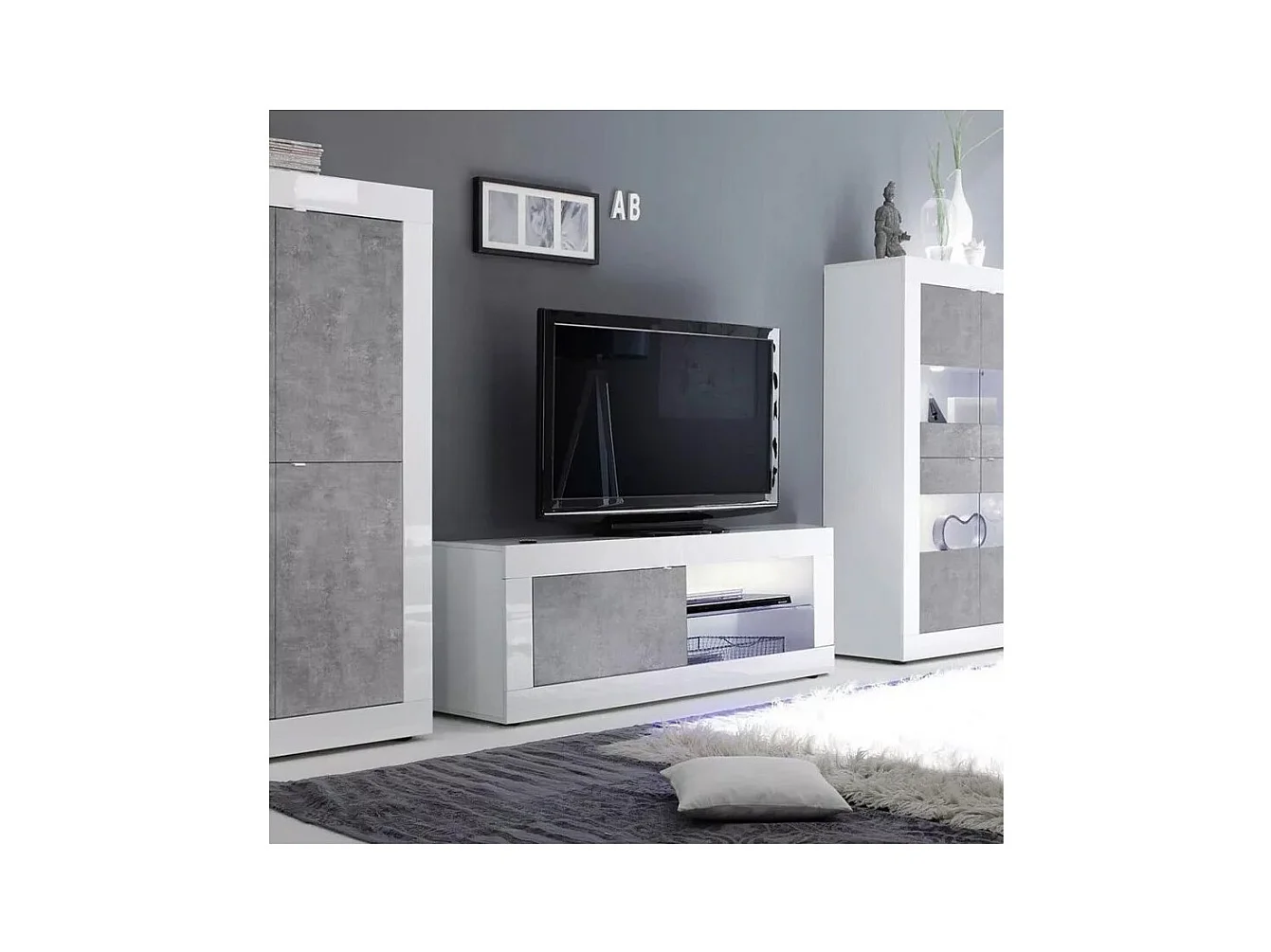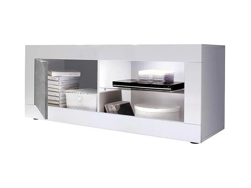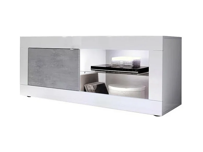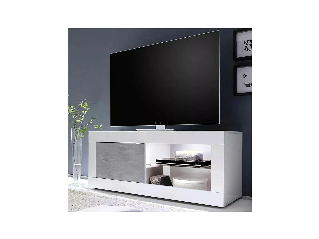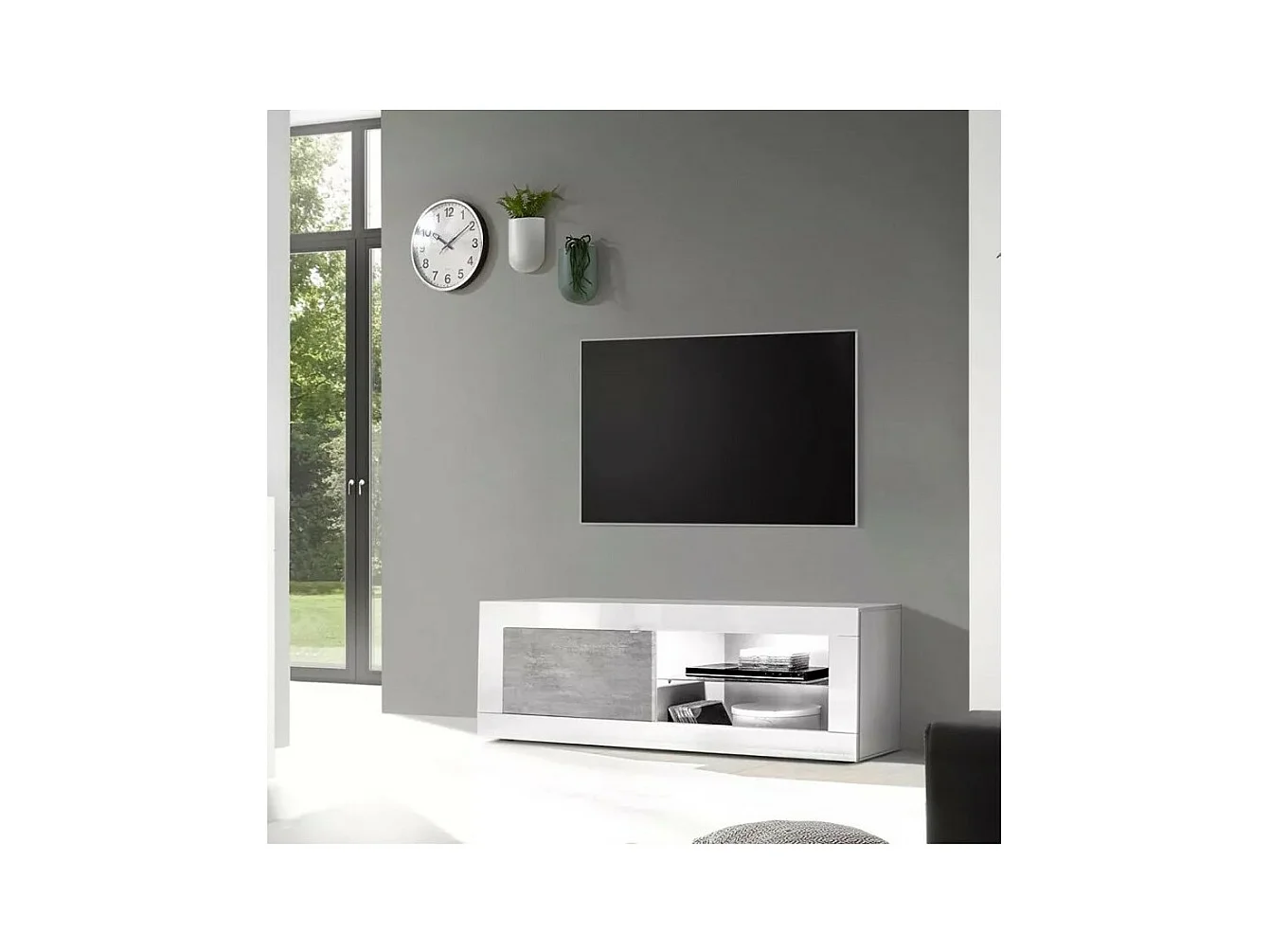 Móvel para TV com 1 porta, coleção CISA, cor branca laqueada brilhante e cinza efeito concreto.
