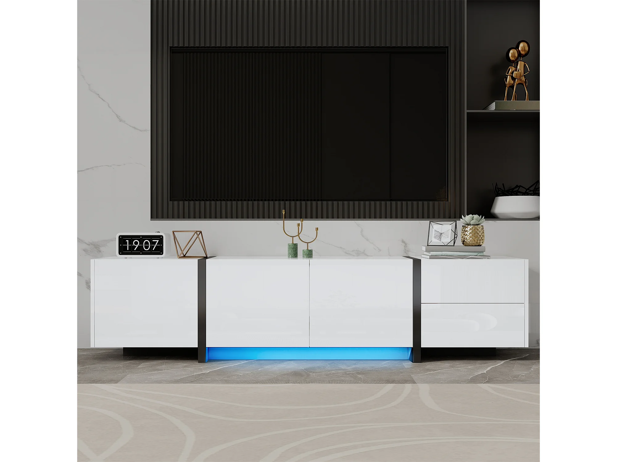 Suporte para TV brilhante - Suporte para TV branco com 3 prateleiras abertas, 2 portas e 2 gavetas - Iluminação LED
