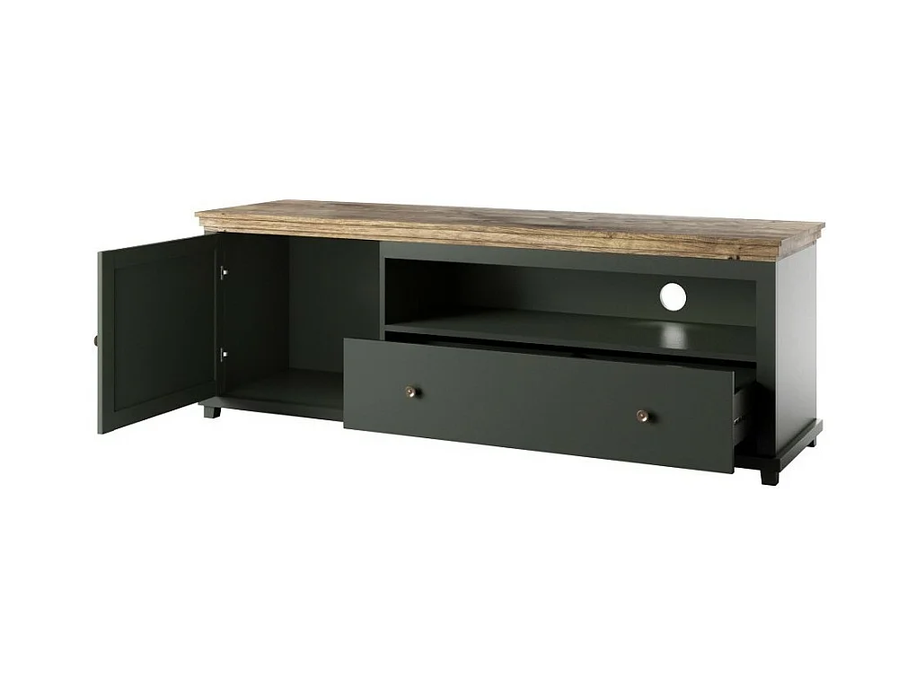 Móvel para TV de 180cm com LED integrado. Coleção ASSIA. Cores verde e carvalho. 1 porta e 1 gaveta.