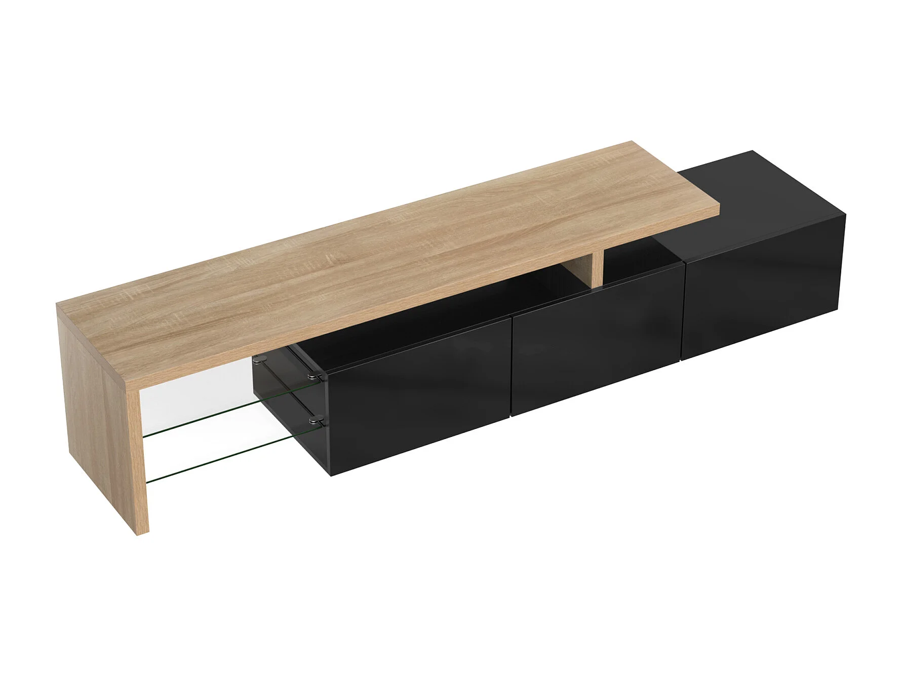 Móvel para TV de 197 cm em preto brilhante com iluminação LED. Móvel baixo para TV com prateleira de vidro e 3 portas.