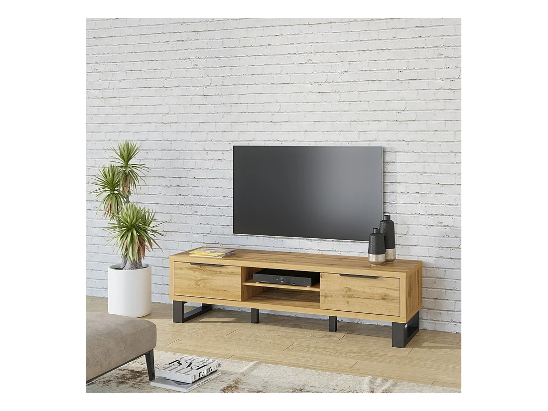 Gabinete de TV 2 gavetas 1 portas e 3 nichos - em MDF - Efeito de grão de madeira e pés de metal - 180x38x50cm
