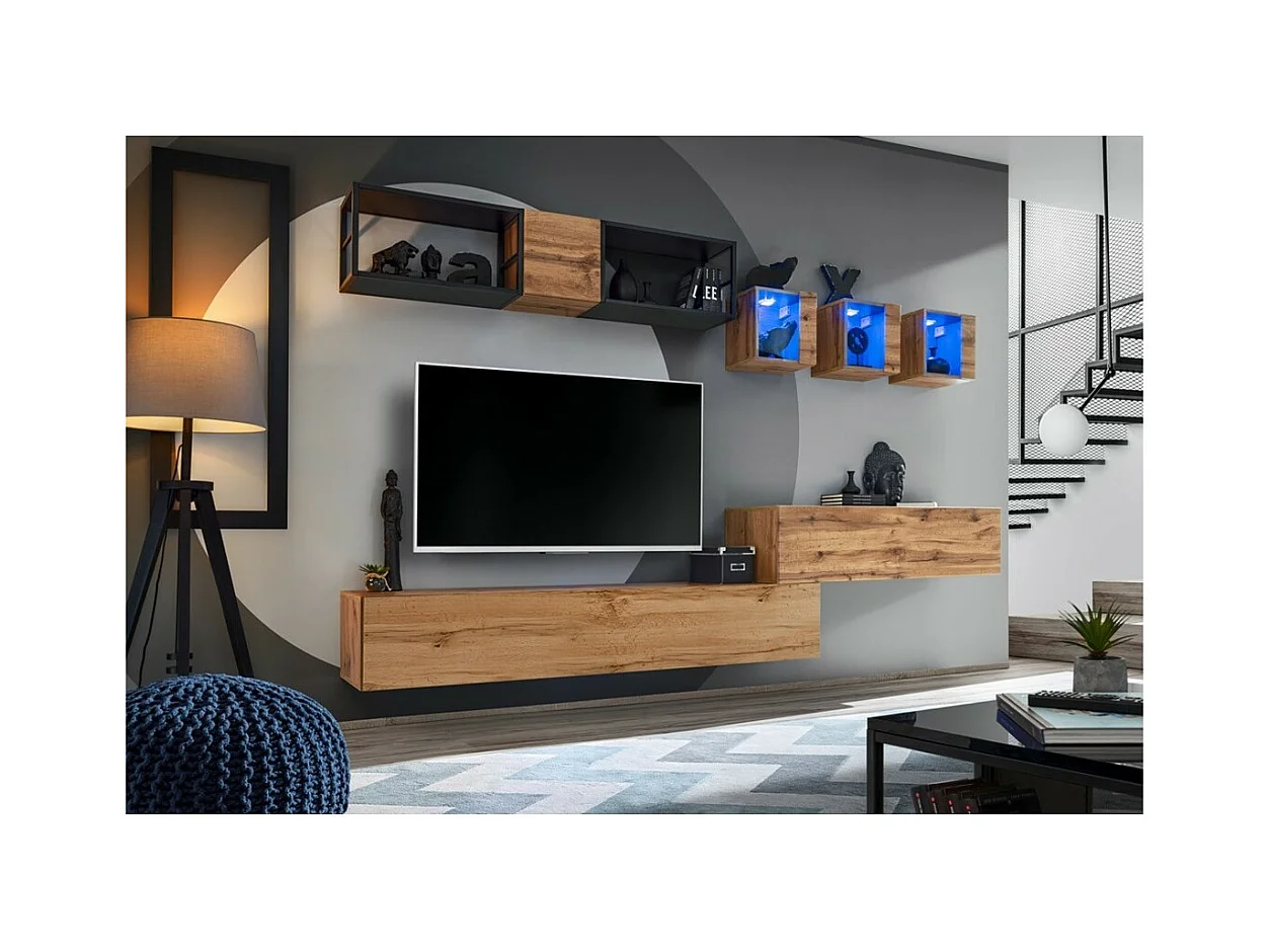 Móvel de TV suspenso de 180 cm com 2 portas e nichos iluminados. Móvel na cor carvalho Wotan. Coleção SWITCH.