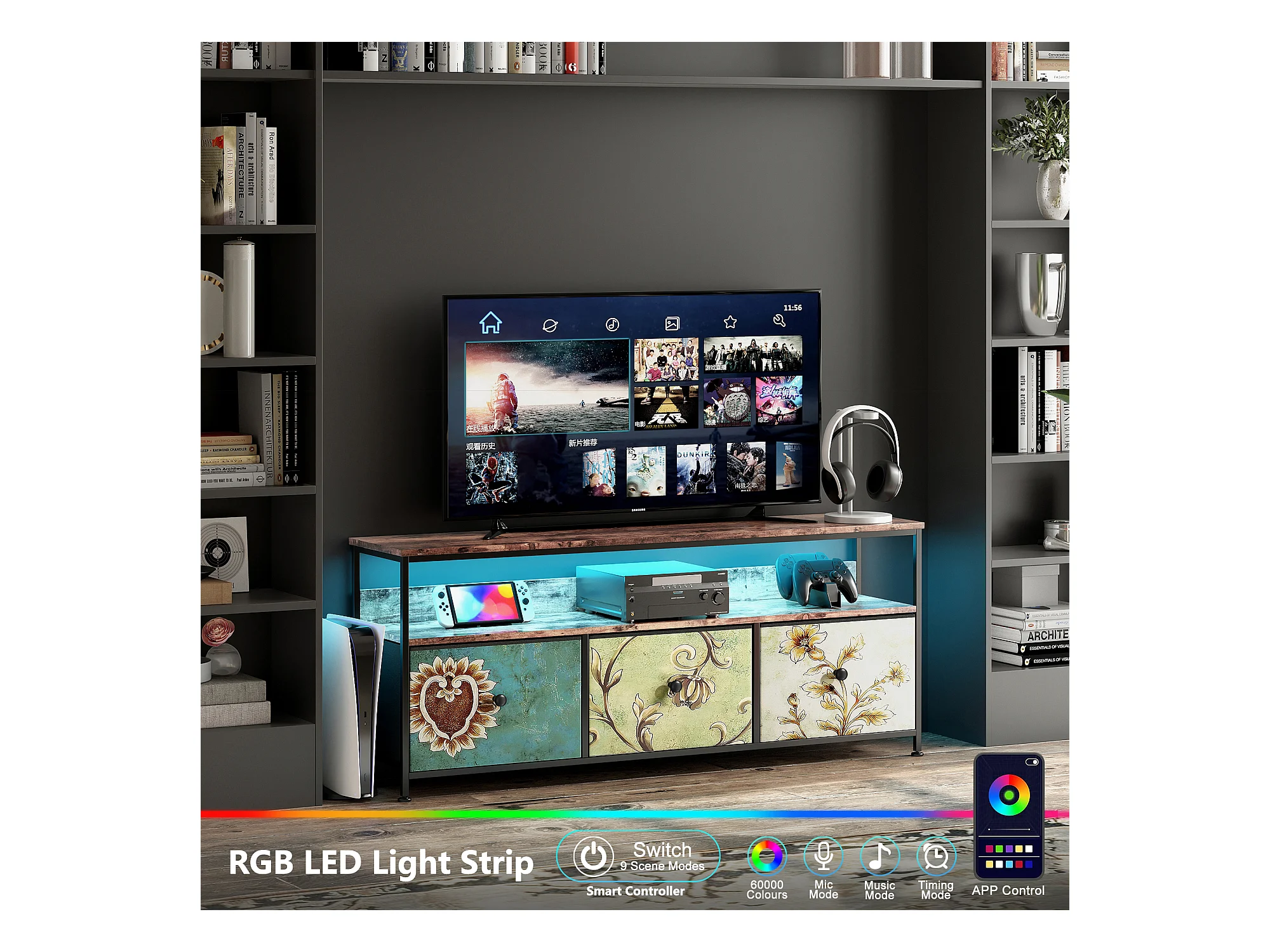 Móvel TV 108 cm com iluminação LED, 4 gavetas em tecido estampado, tampo em madeira de tigre, estrutura metálica, pés reguláveis