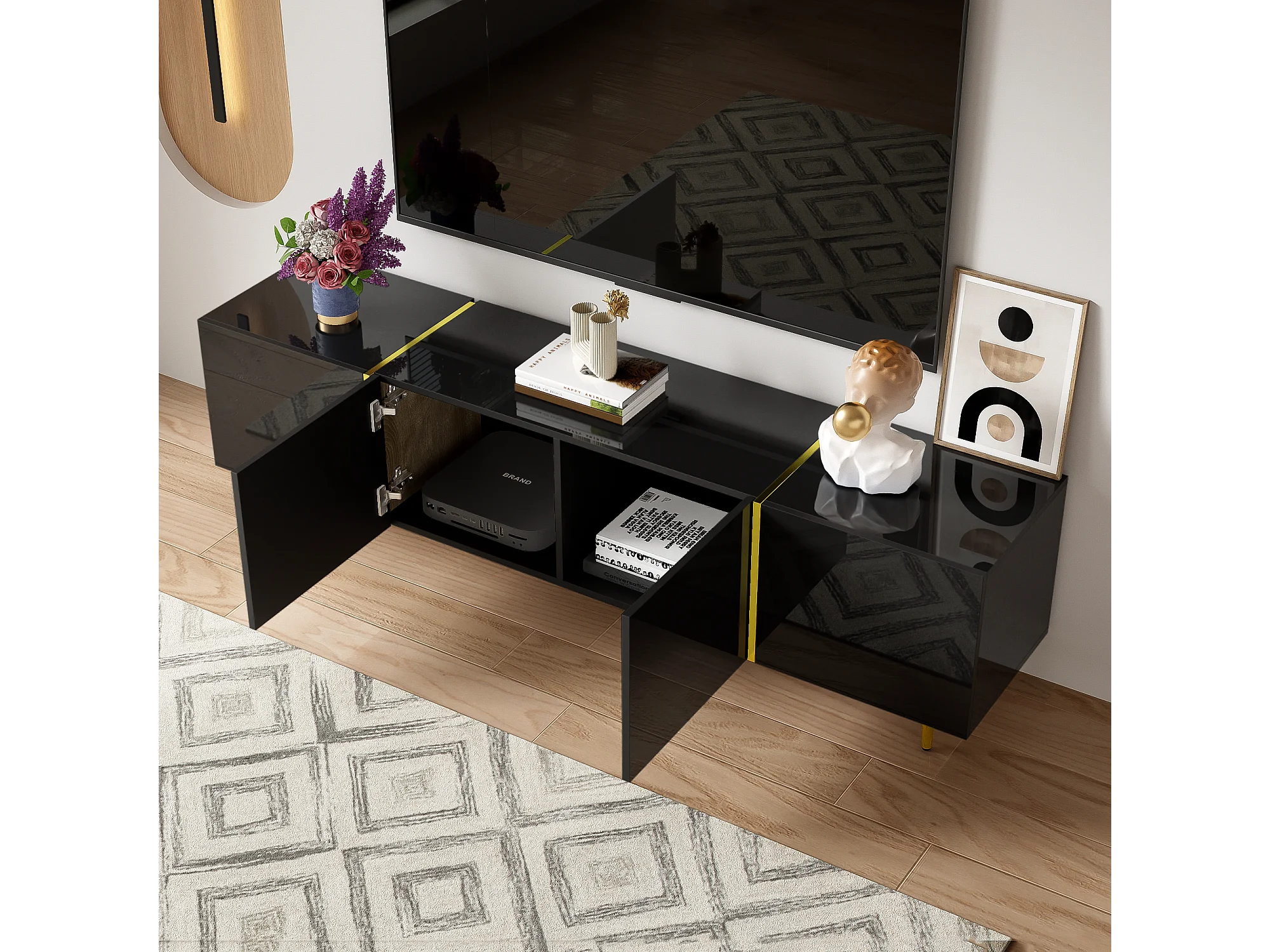 Móvel TV 170x35x46cm - Móvel 4 portas brilhante - moderno e simples - MDF preto