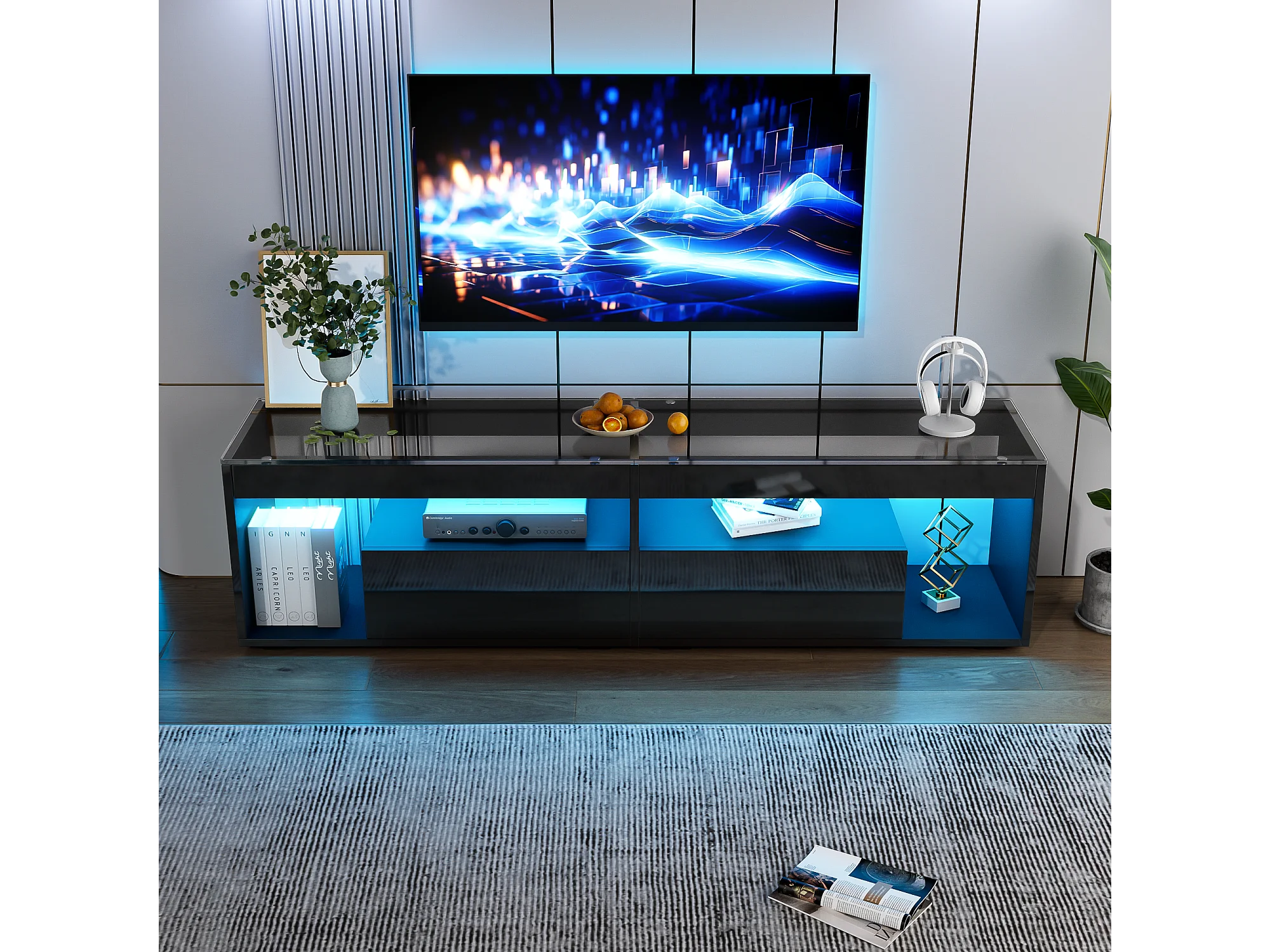 Móvel TV 180x40x46cm com 2 gavetas, LED incluído, corpo em lacado preto