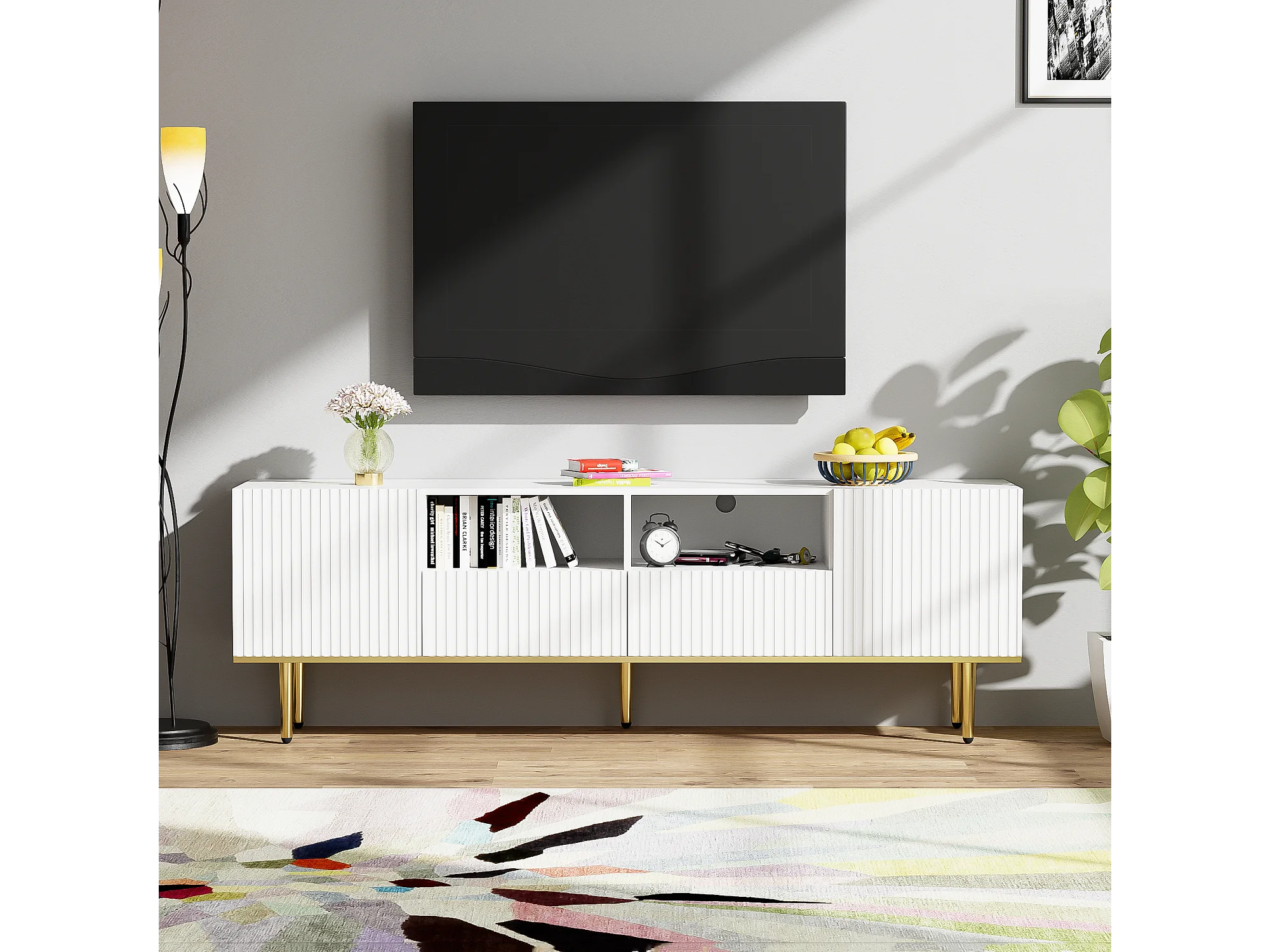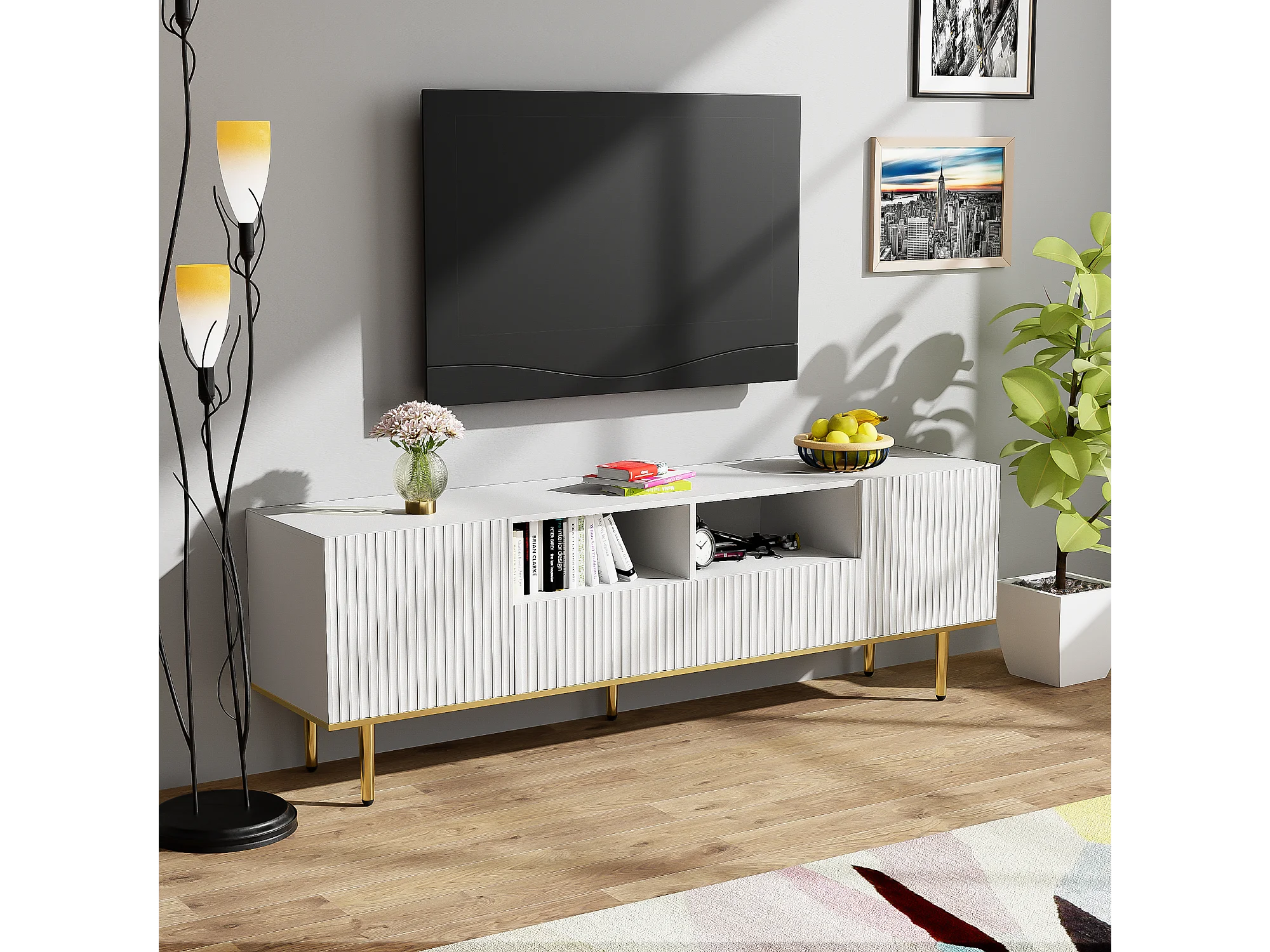 Móvel TV com 2 gavetas, 2 portas e 2 nichos - 165x36x55cm - padrão listrado vertical - Aglomerado - branco