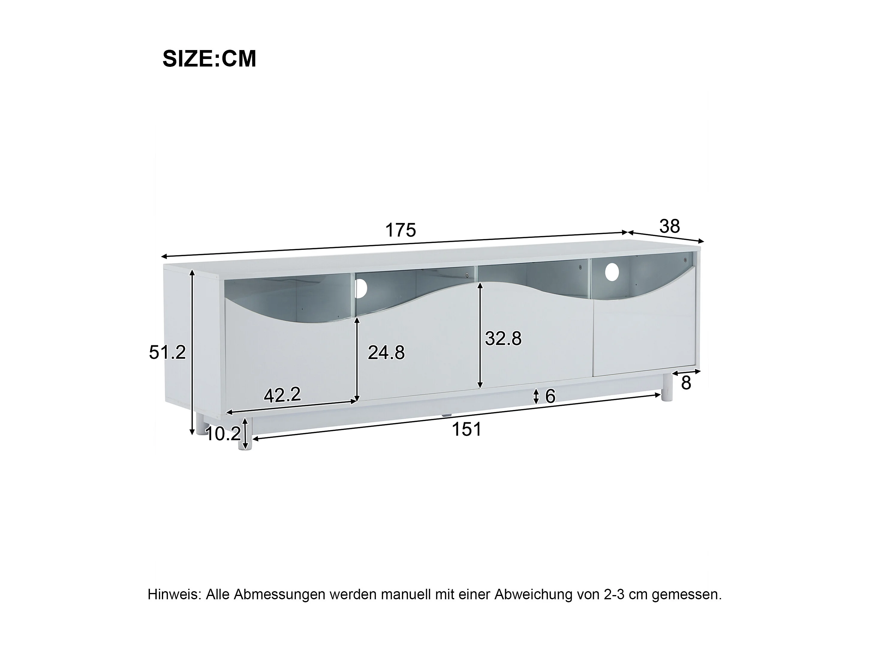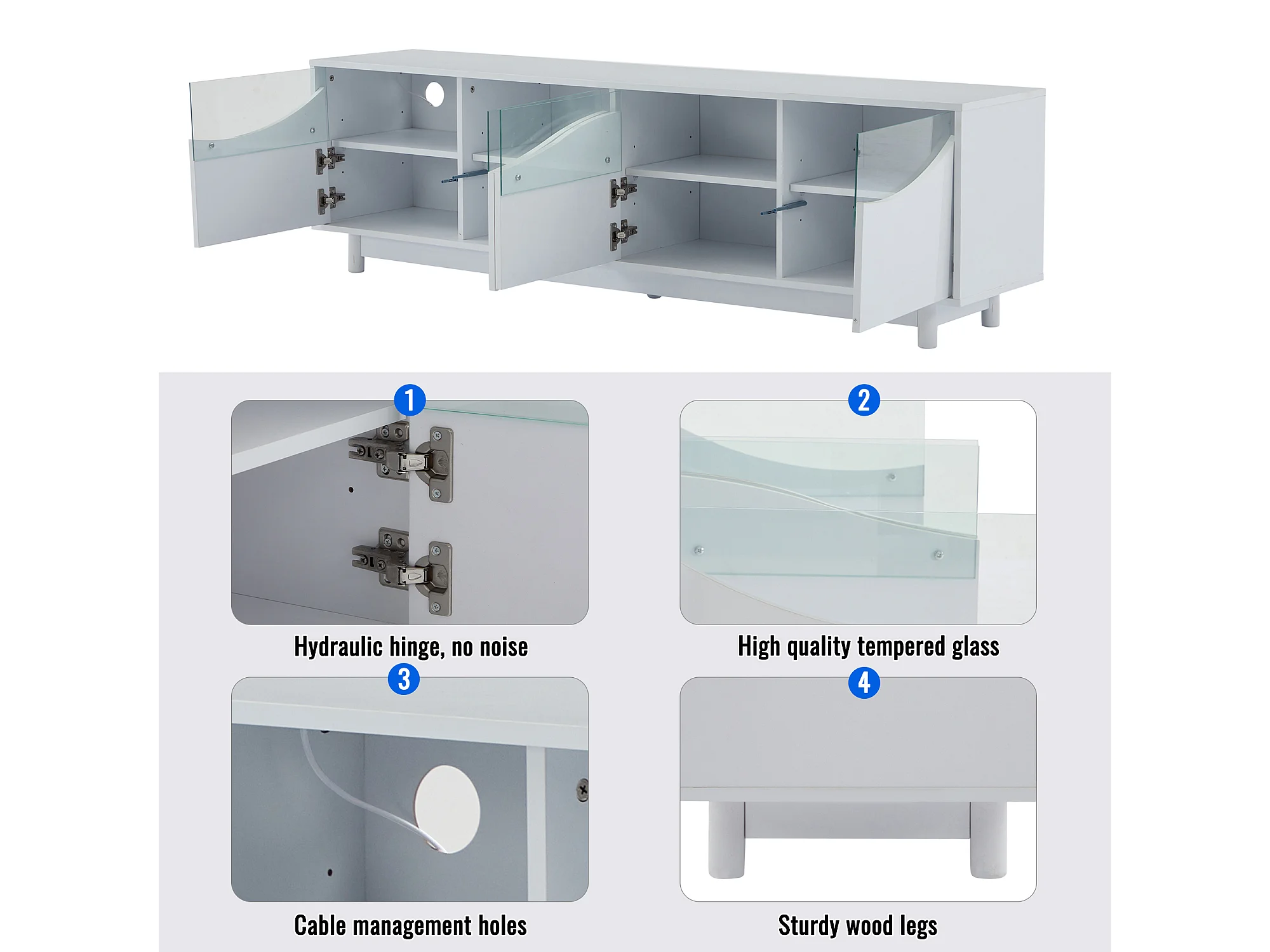 Móvel para TV com iluminação LED, com 4 portas de vidro, portas com design curvo, 175x38x51 cm, branco
