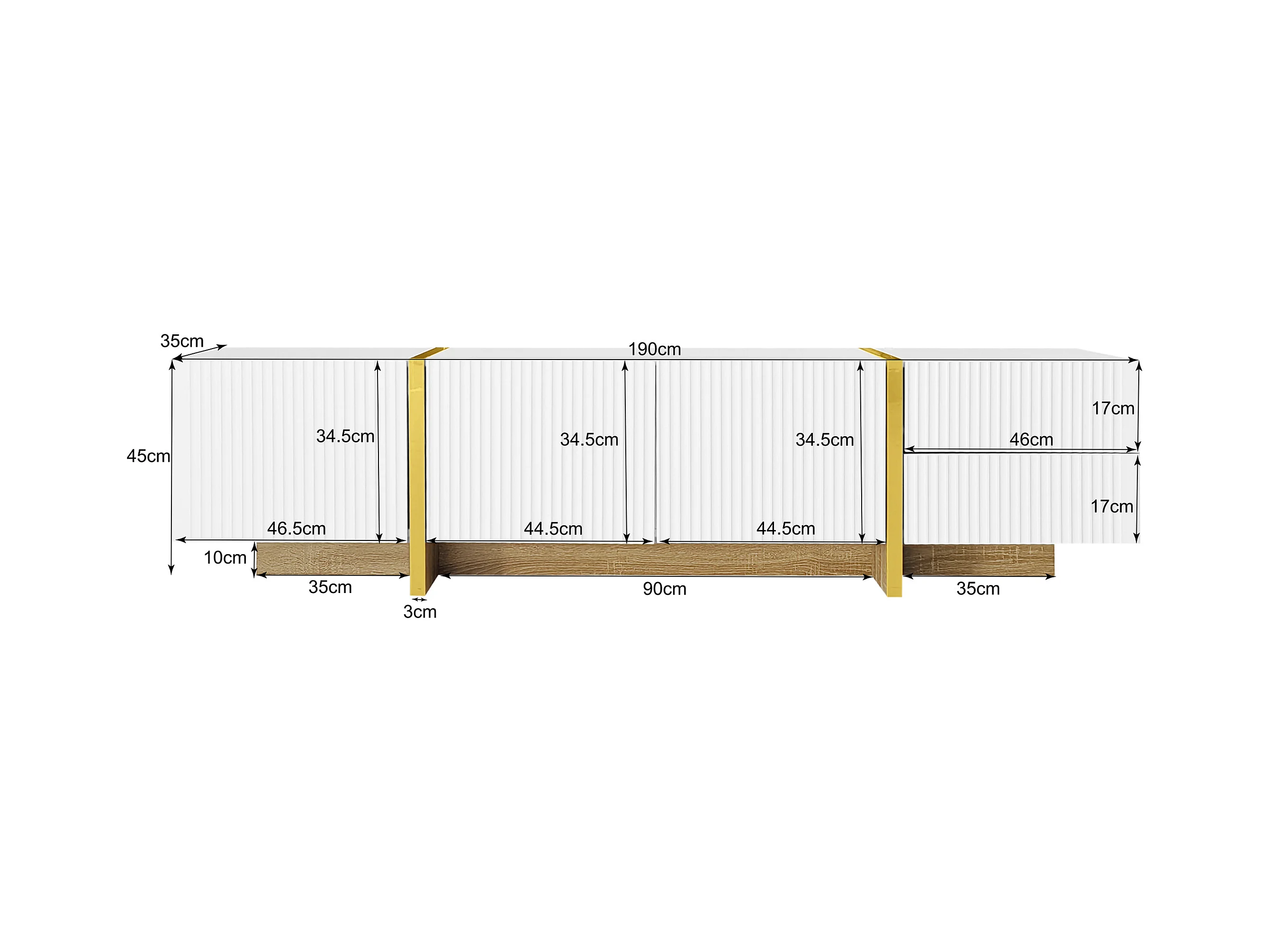 Móvel TV MDF 190 cm com 3 portas e 2 gavetas madeira branca dourada sala de estar moderna
