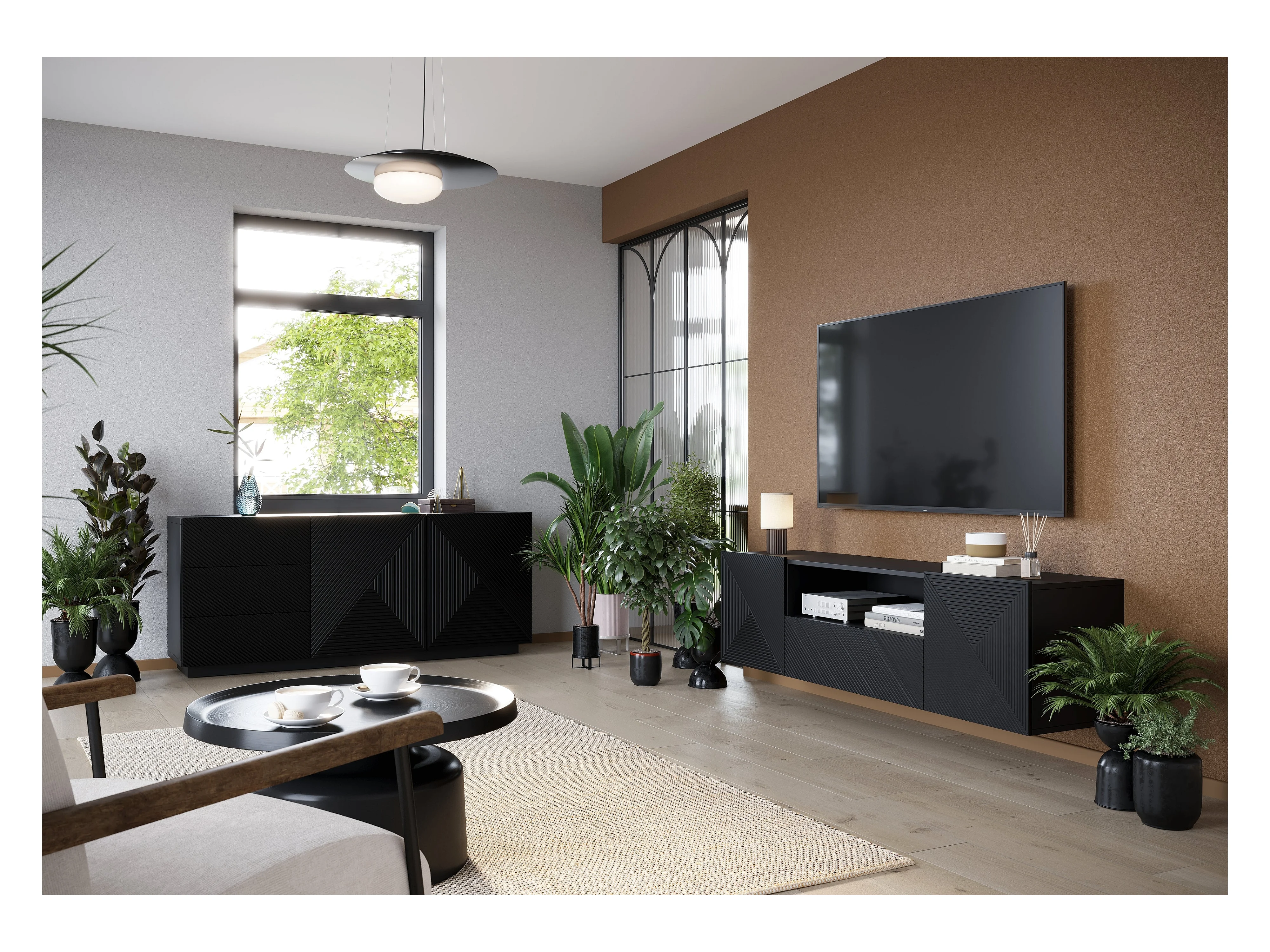 Móvel de TV moderno 180 cm para sala – 2 portas sem puxadores, acabamento mate, de chão ou suspenso, frentes em MDF preto mate