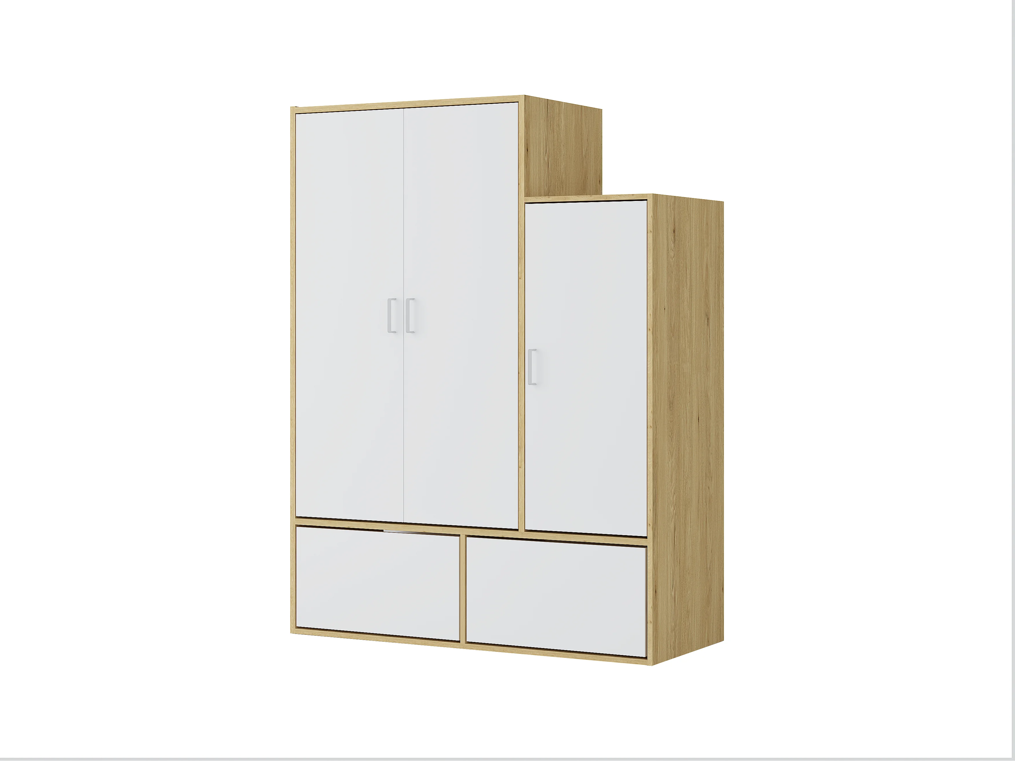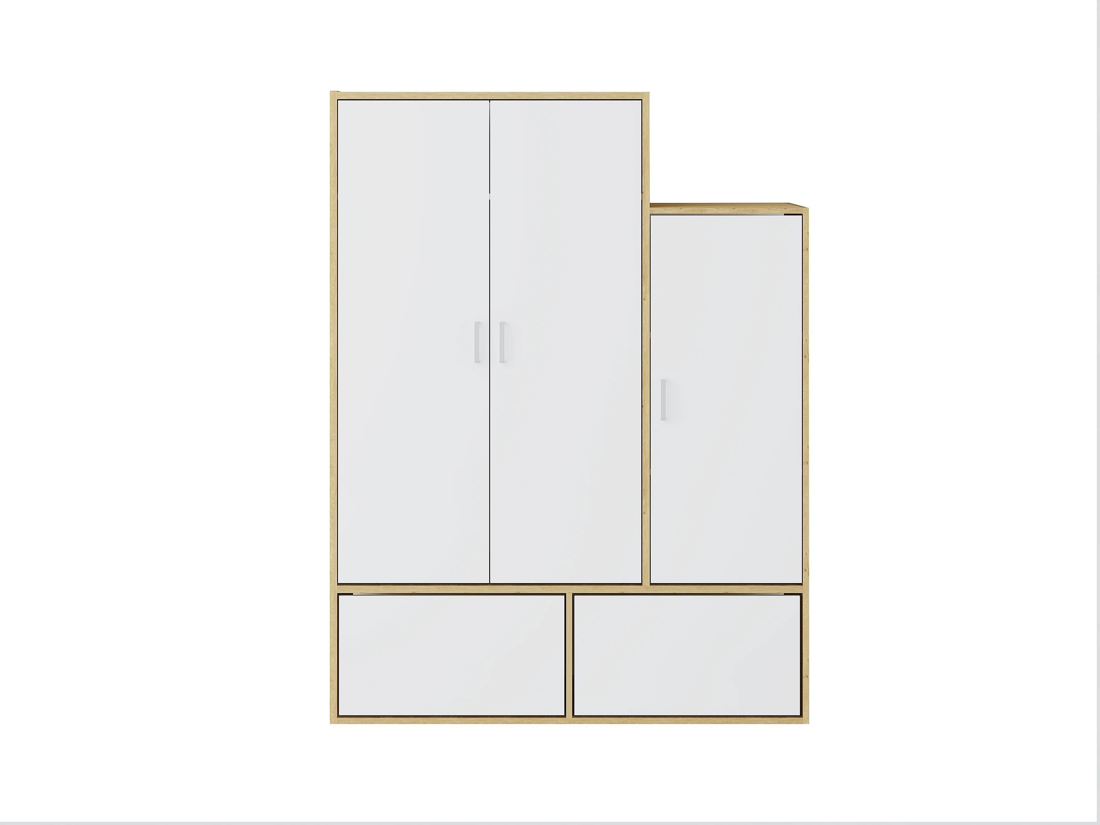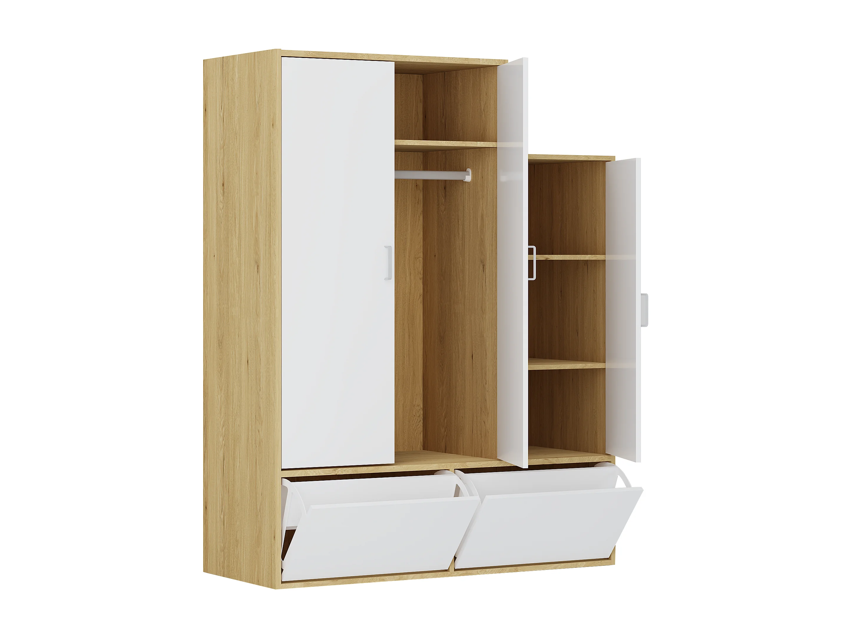 Guarda-roupa com 3 portas, 1 barra de pendurados e 2 compartimentos para calçado branco e natural - NYVELA