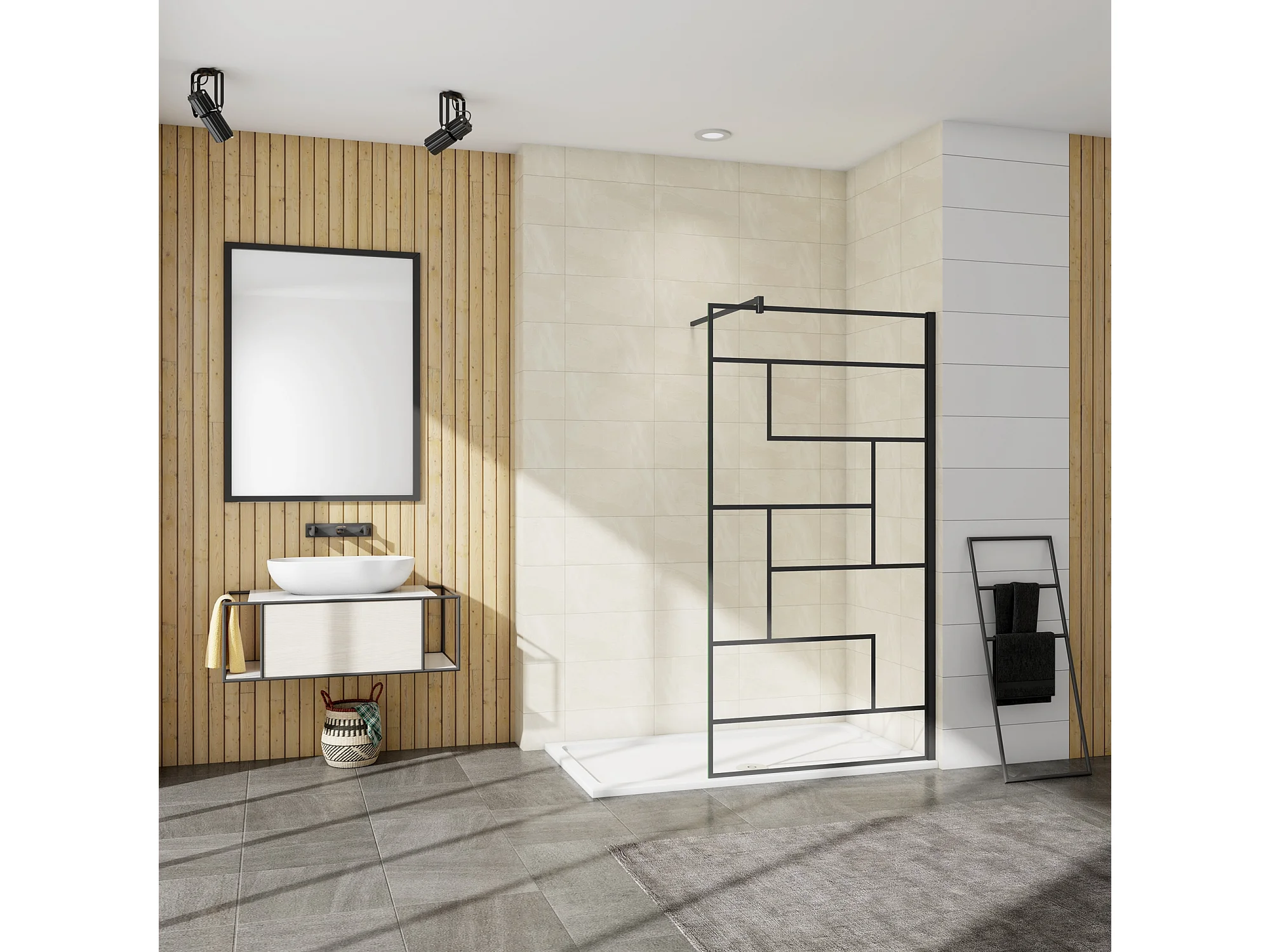 Painel de duche Fixo treliça quadrada serigrafada Vidro Anti-calcário 8mm com Barra 70-120cm Perfil Preto fosco (78-80)x200cm-AICA