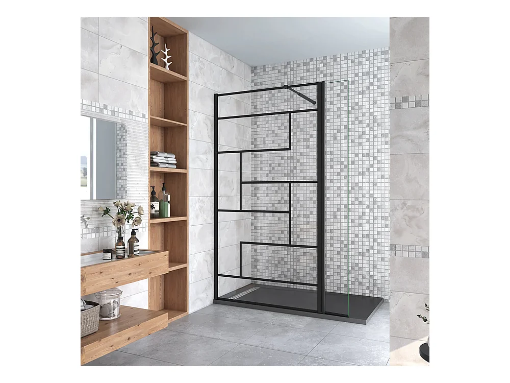 Painel de duche Movível Serigrafia em treliça quadrada 2 folhas Vidro 8mm Anti-calcário com Barra Preta fosca 90cm Tamanho[(83.9-85.9)+40]x200cm-AICA