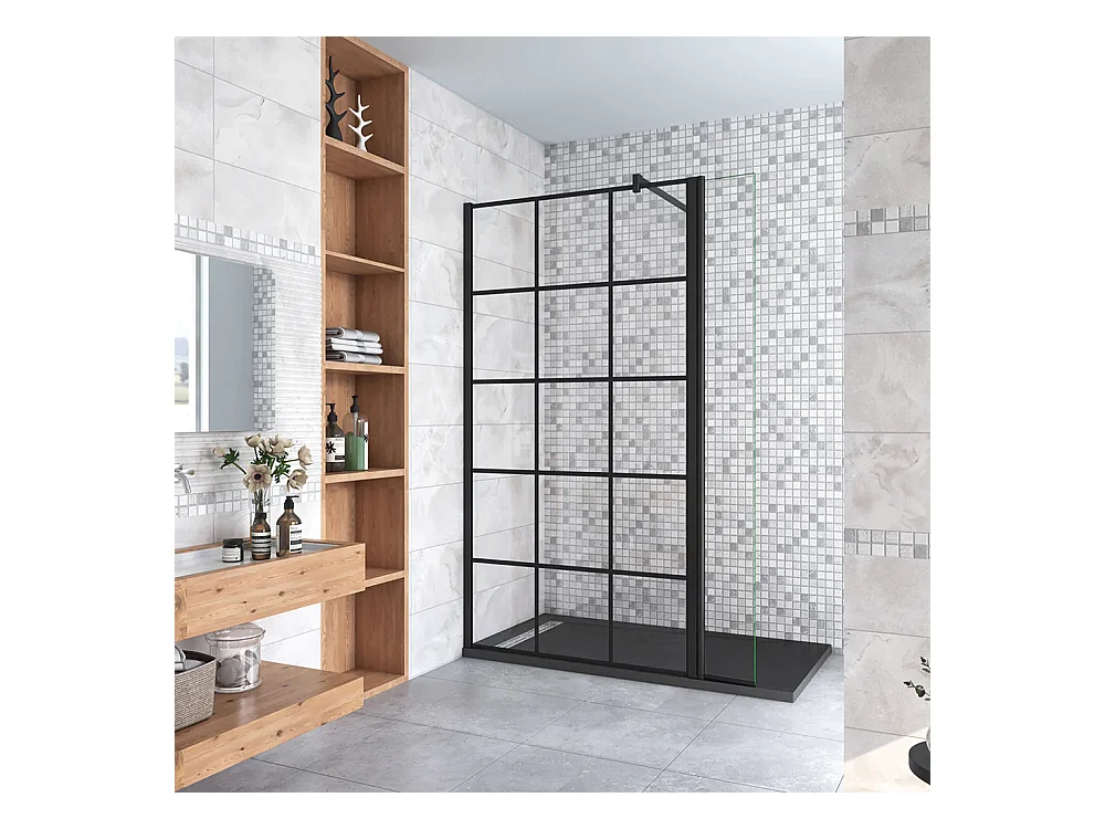 Painel de duche Movível Serigrafia em treliça quadrada 2 folhas Vidro 8mm Anti-calcário com Barra Preta fosca 90cm Tamanho[(83.9-85.9)+30]x200cm-AICA
