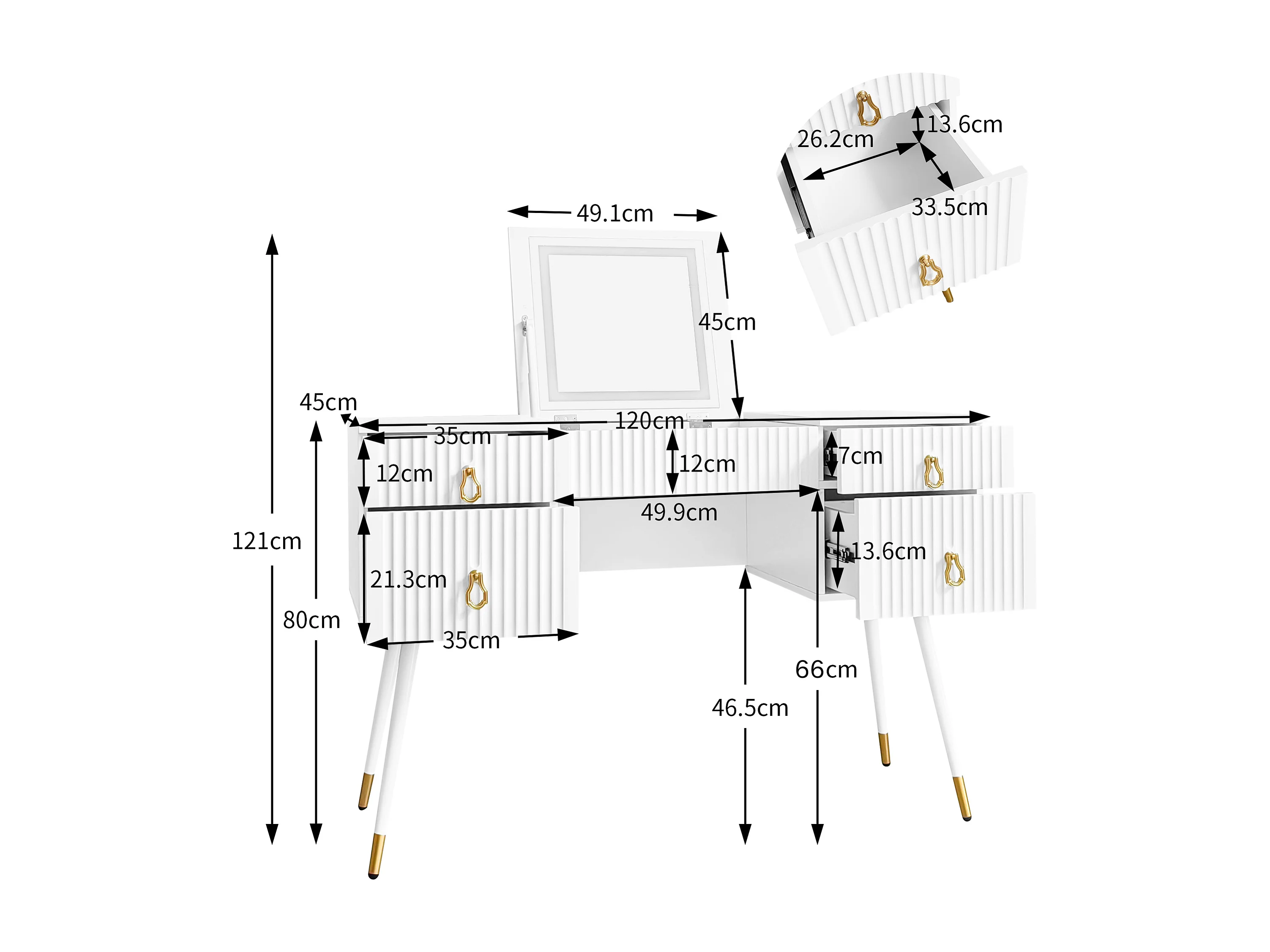 Penteadeira branca (sem cadeira), com espelho LED de luz regulável, ferragens douradas de luxo, com 4 gavetas