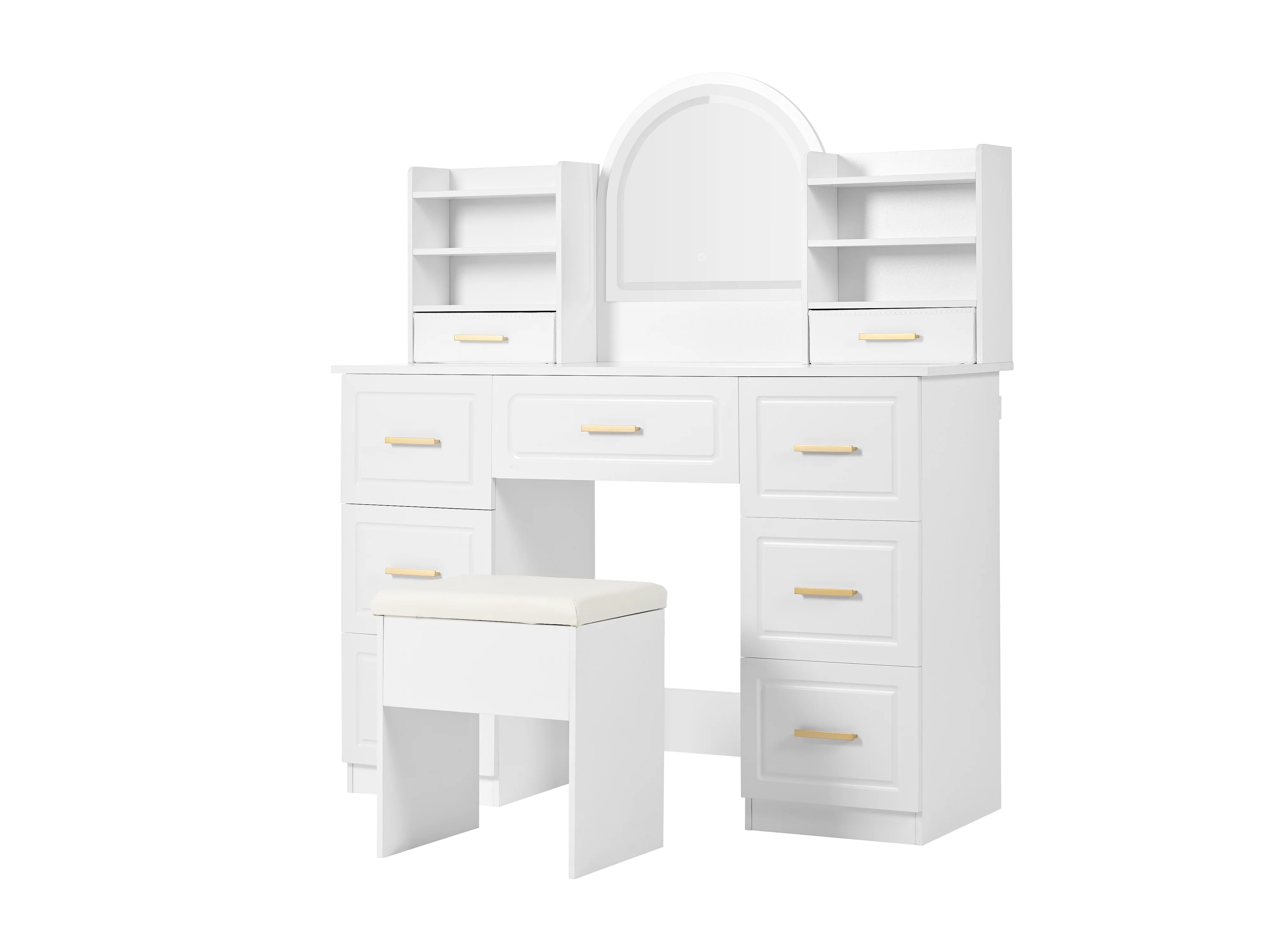 Penteadeira com 9 gavetas, espelho e banco - 120 x 40 x 135 cm - LEDs - Aglomerado - Branco