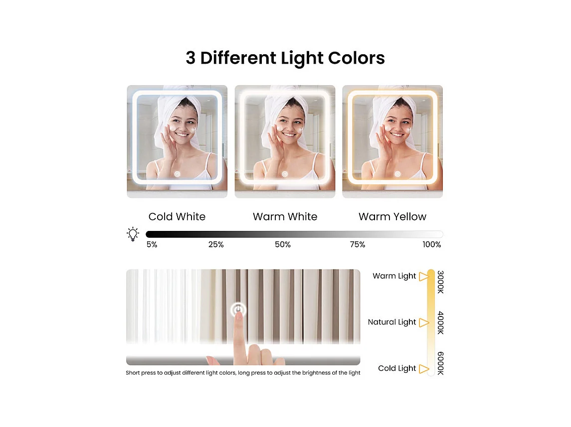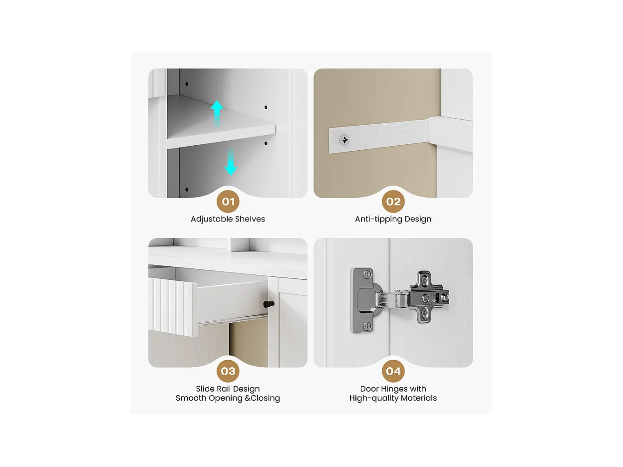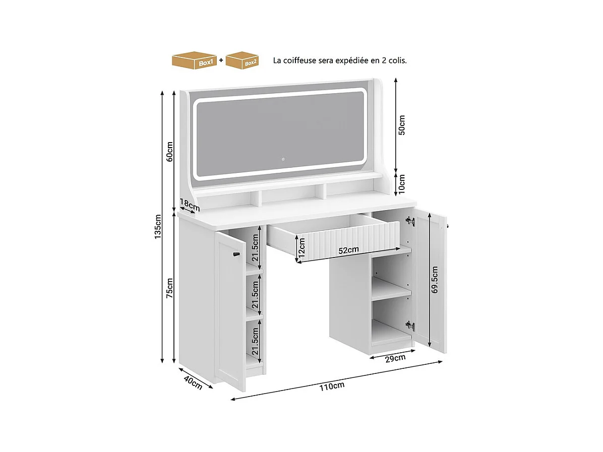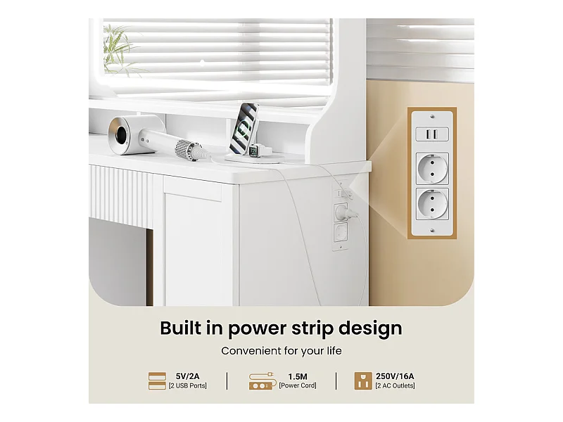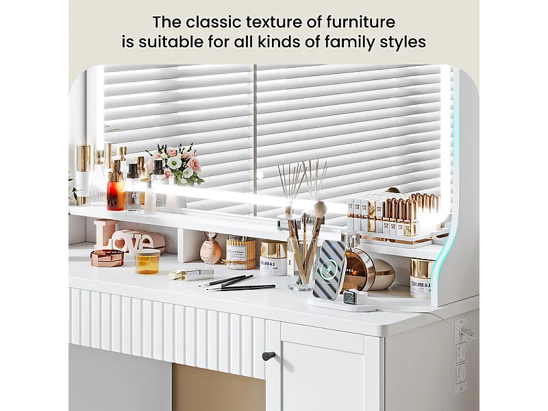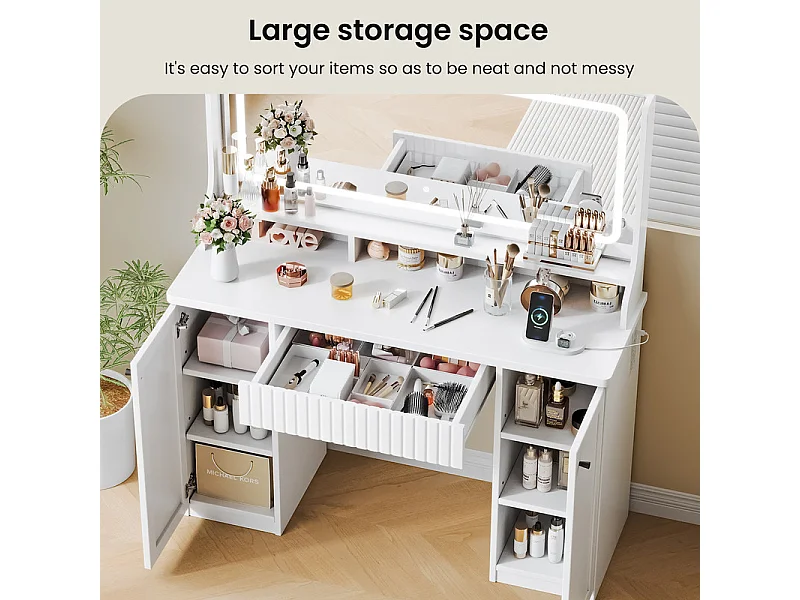 Penteadeira, Grande Espelho LED com Brilho Ajustável, 1 Gaveta e 2 Portas, 2 Tomadas AC e 2 Portas USB, Branco, 110x40x135cm