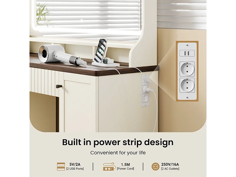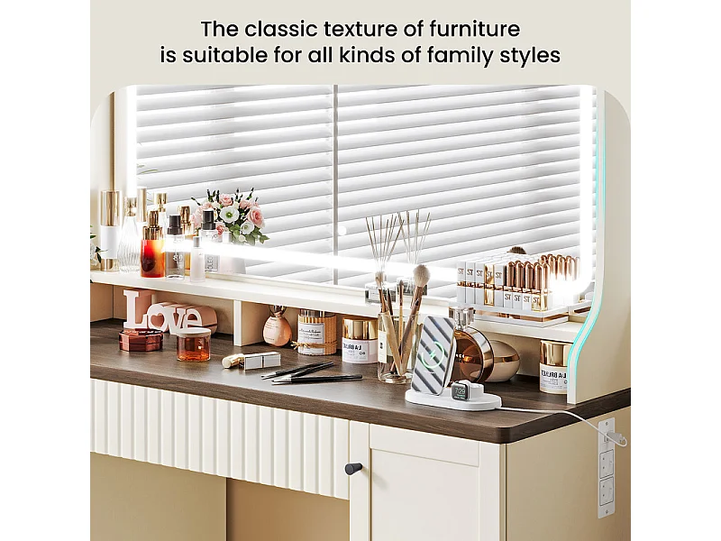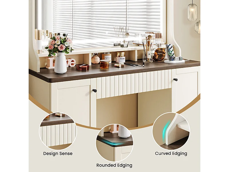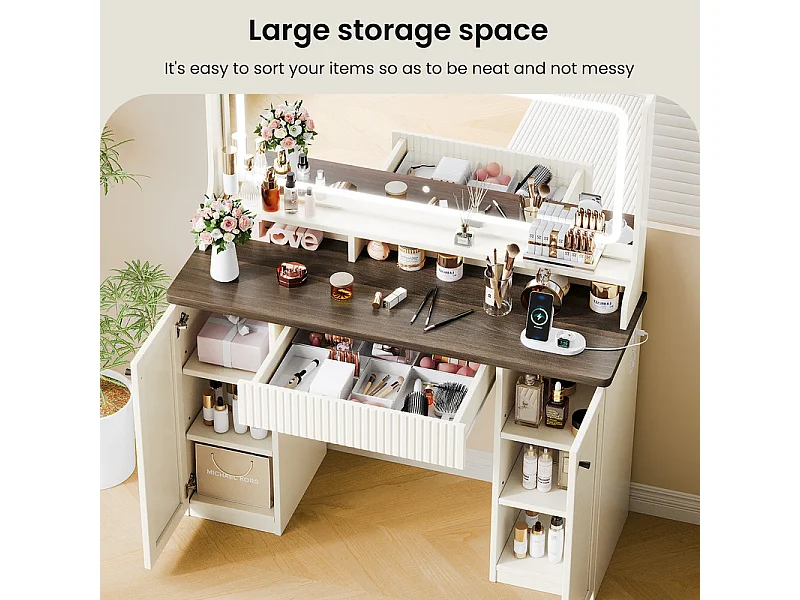 Penteadeira, Grande Espelho LED com Brilho Ajustável, 1 Gaveta e 2 Portas, 2 Tomadas AC e 2 Portas USB, Marrom Chocolate, 110x40x135cm