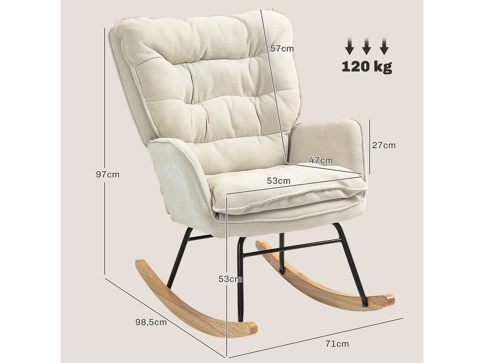 Cadeira de baloiço em veludo bege Teddy com bolsos laterais e apoios de pernas ocultos, estrutura em madeira
