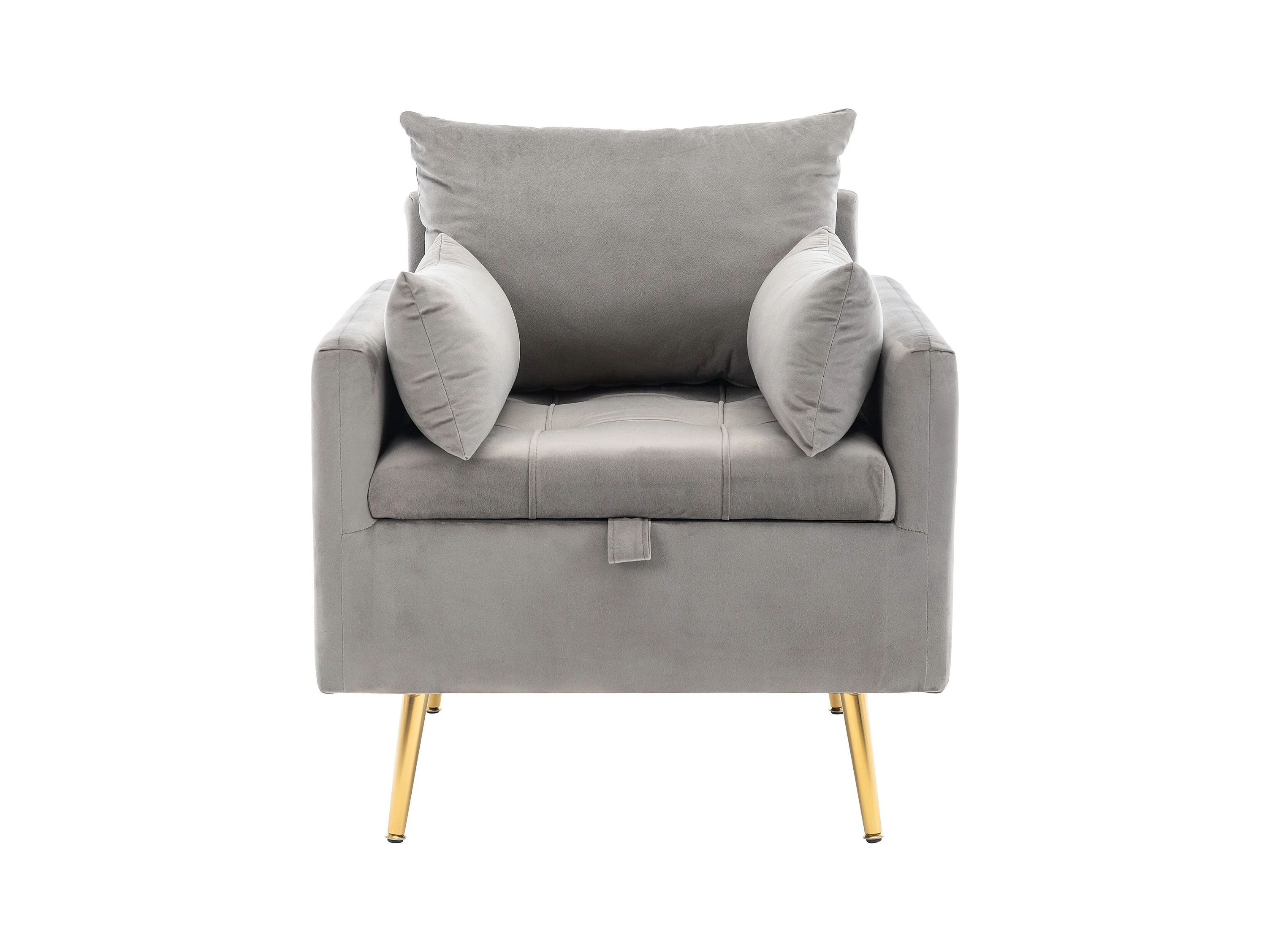 Poltrona com compartimento de arrumação, almofadas decorativas, apoios de braços, pés em metal dourado, cinza