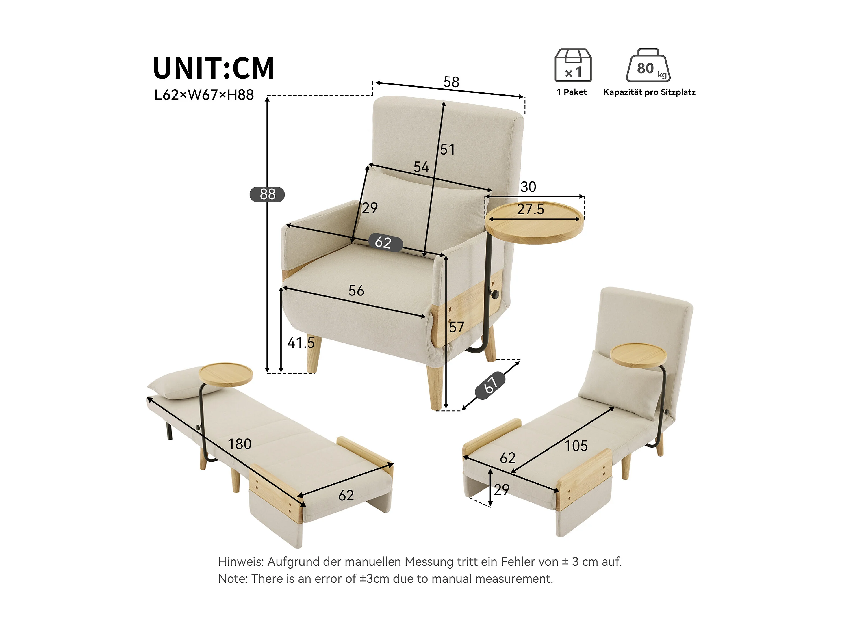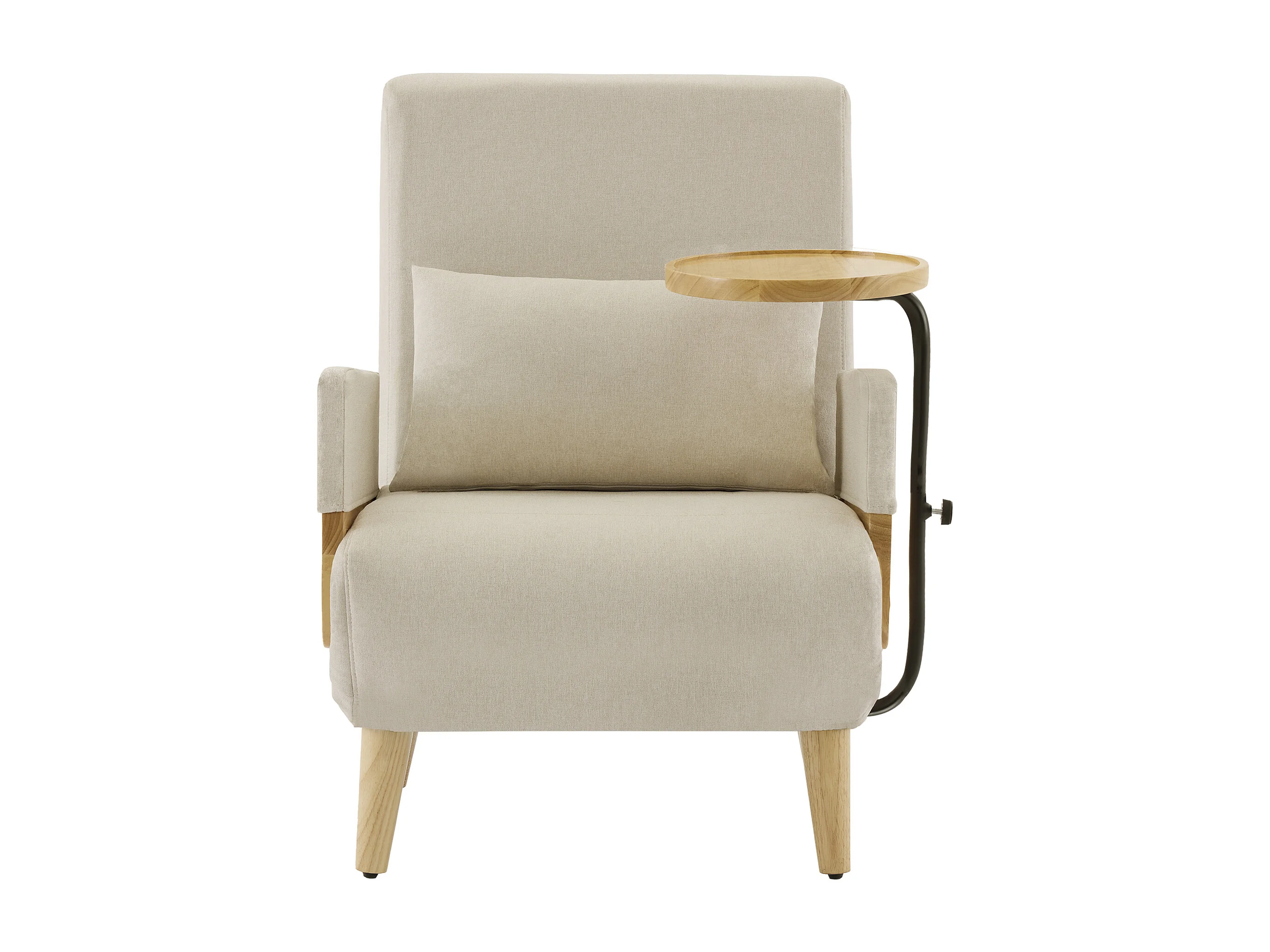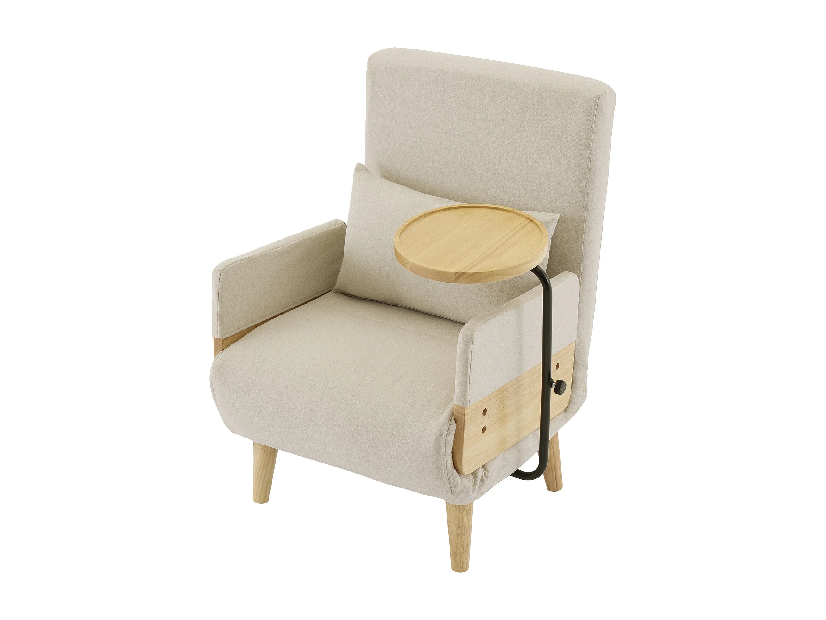 Poltrona conversível três em um com função de cama, equipada com bandeja de madeira, bege